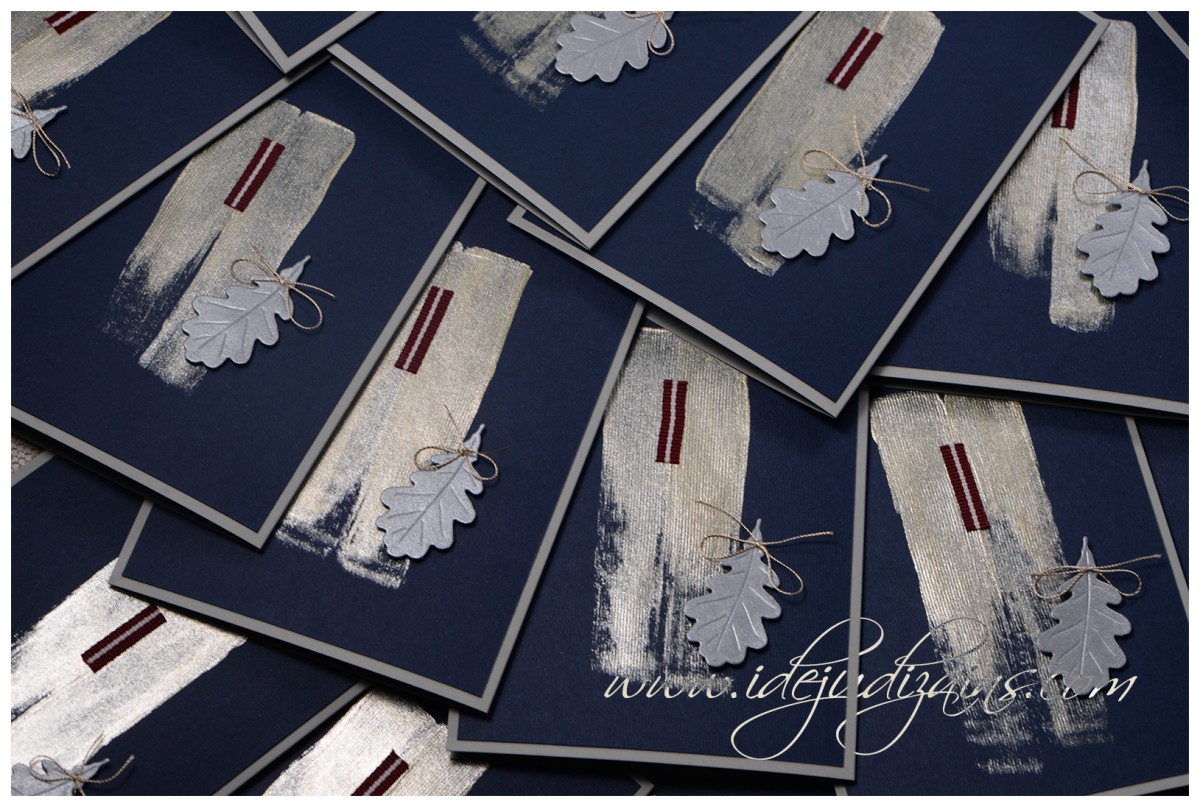 Apsveikuma kartītes Latvijas svētkiem vai Ziemassvētkiem latviskā, nacionālo identitāti vēstošā stilā. Izmērs: 10.5x14.5cm.