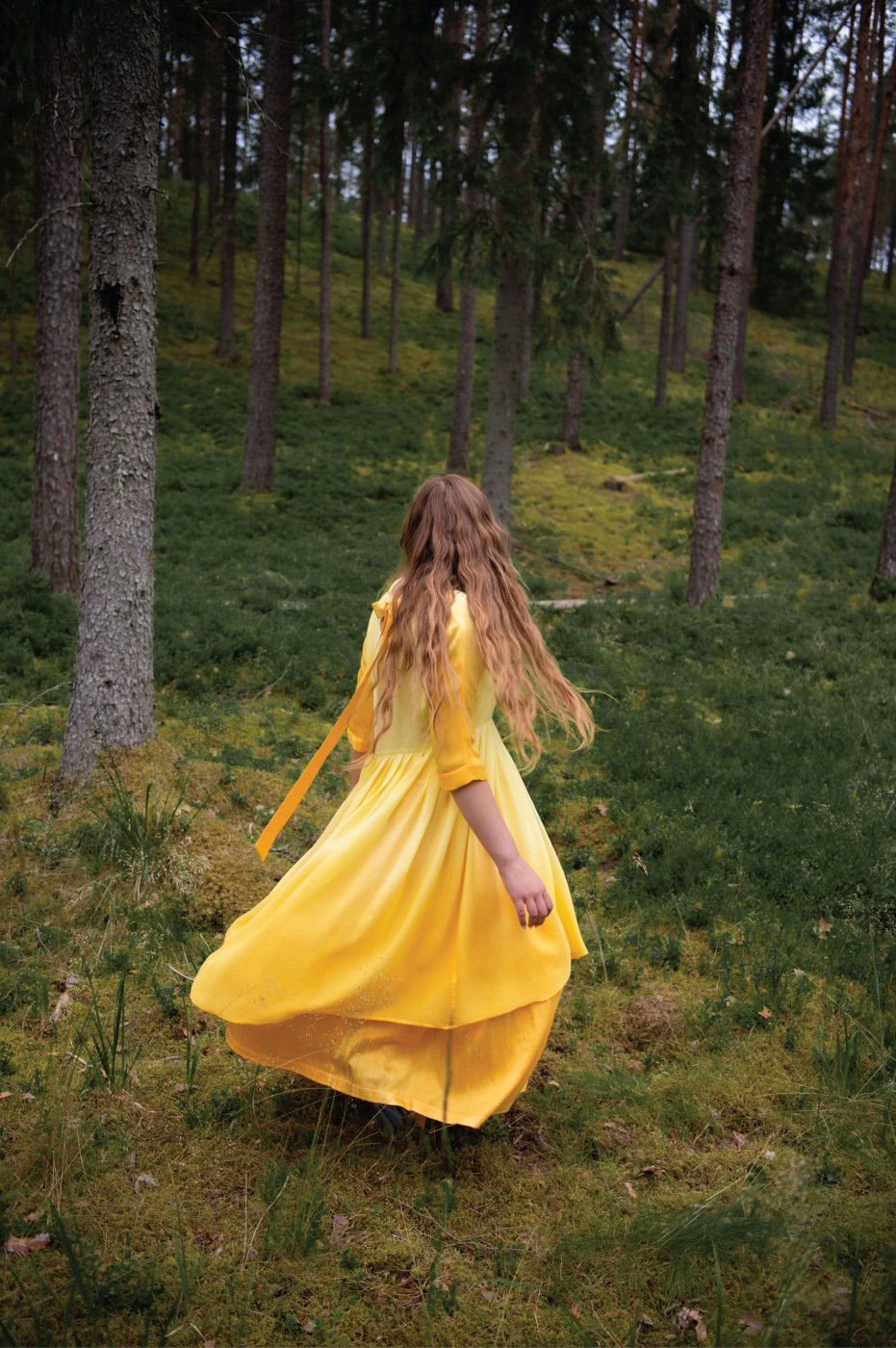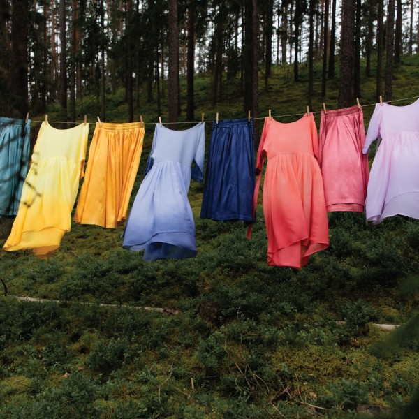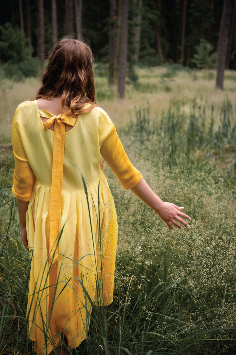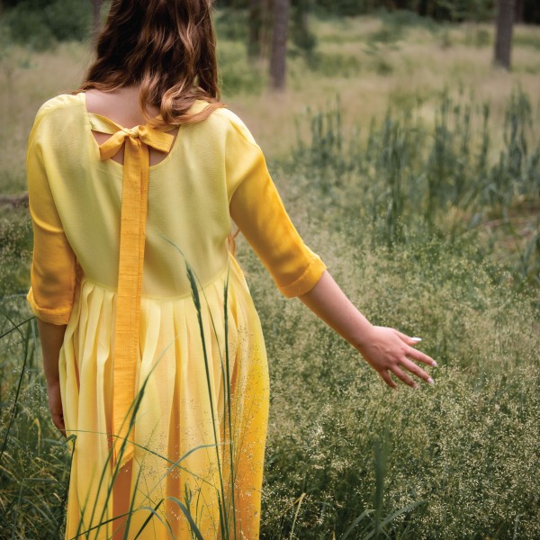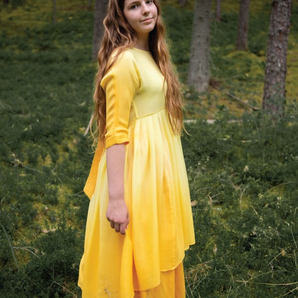 100% Dabīga zīda kleitas un svārku komplekts. Kleitas daļa šūta no Šifona zīda, bet svārku daļa no Dupioni zīda. Ar rokām krāsota izmantojot "Dip Dye" (iemērkšanas) tehniku radot ļoti ekskluzīvu un māksliniecisku efektu.