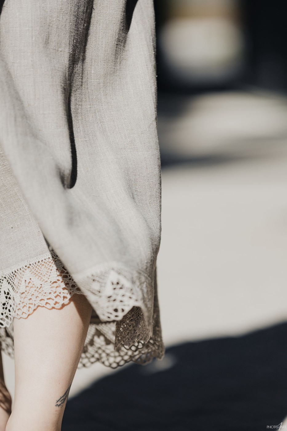 Klasiska lina kleita ar 100% lina mežģīnēm un kabatām. Derēs XS/S izmēram. Kleitas garums ir 1,27m. Pasūtījuma izpildes laiks: 5 darba dienas.