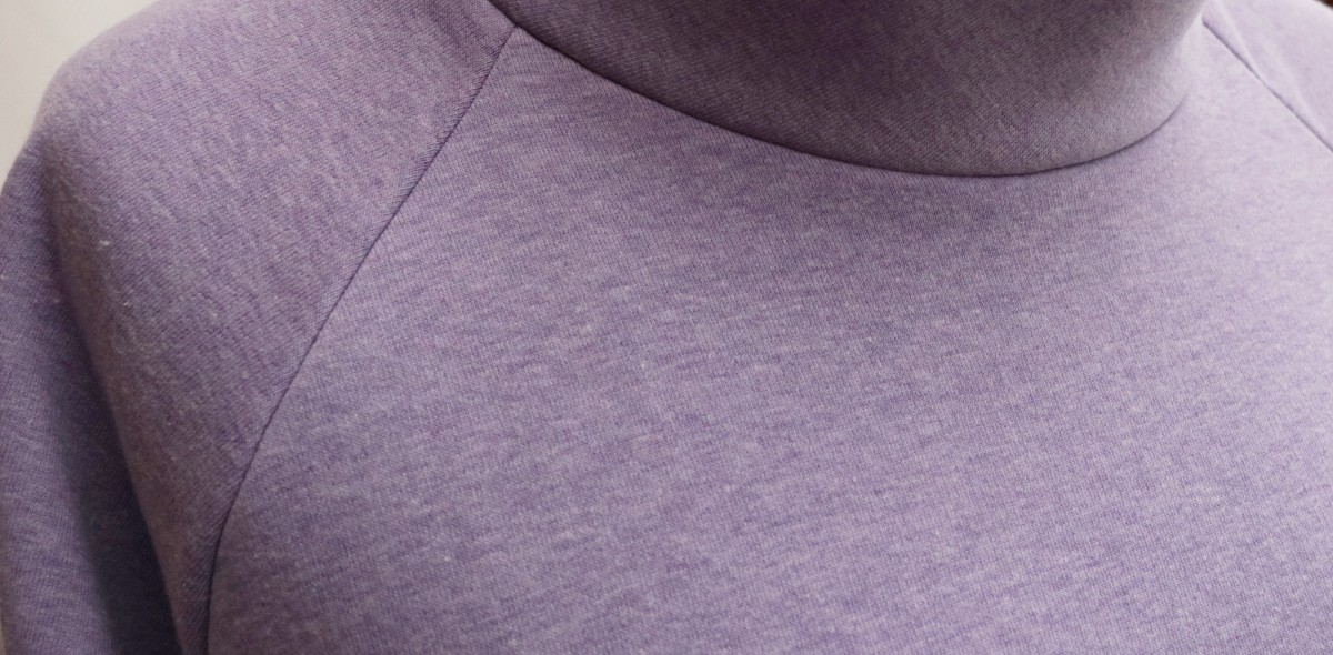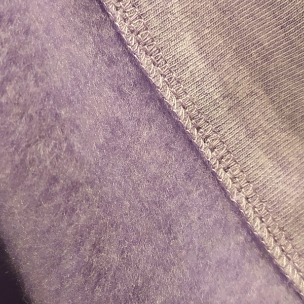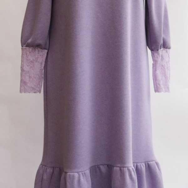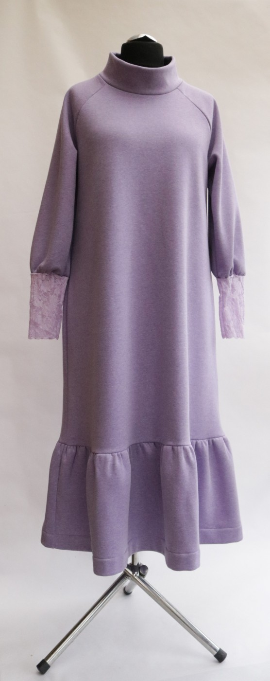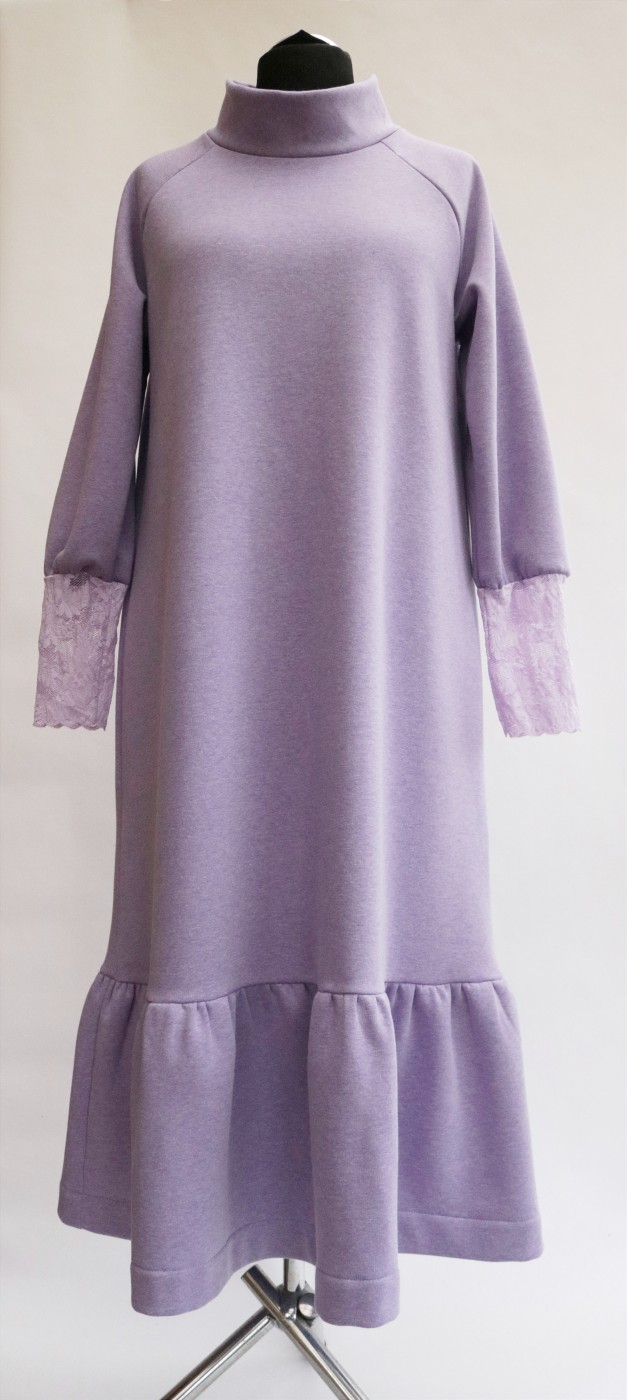 Gaiši violetas melanžas trikotāžas garā kleita ar siltu iekšpusi.Piedurknes galos mežģīne.Kleita ar reglāna piedurknēm un volānu. Kleitas tonis ir nedaudz gaišāks nekā foto.