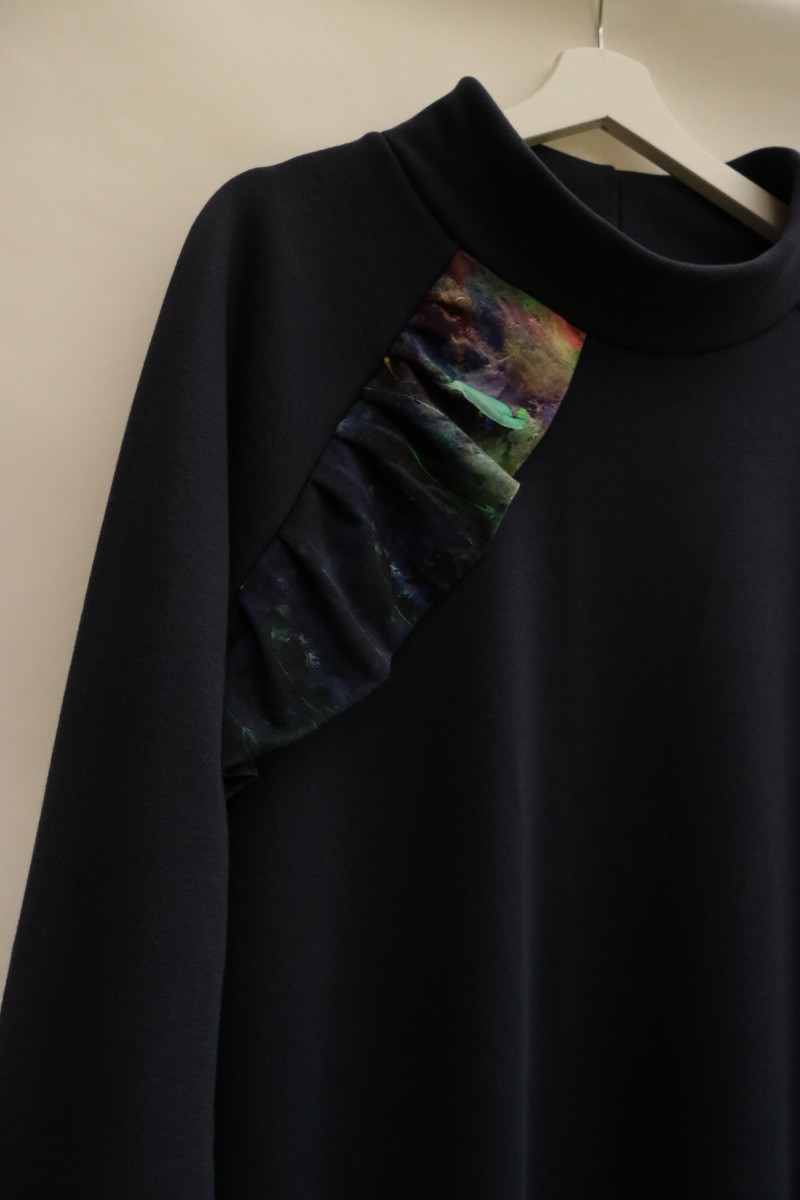 Apakšmala - rievietā kokvilnas trikotāža; krāsains volāns - kokvilnas trikotāža.