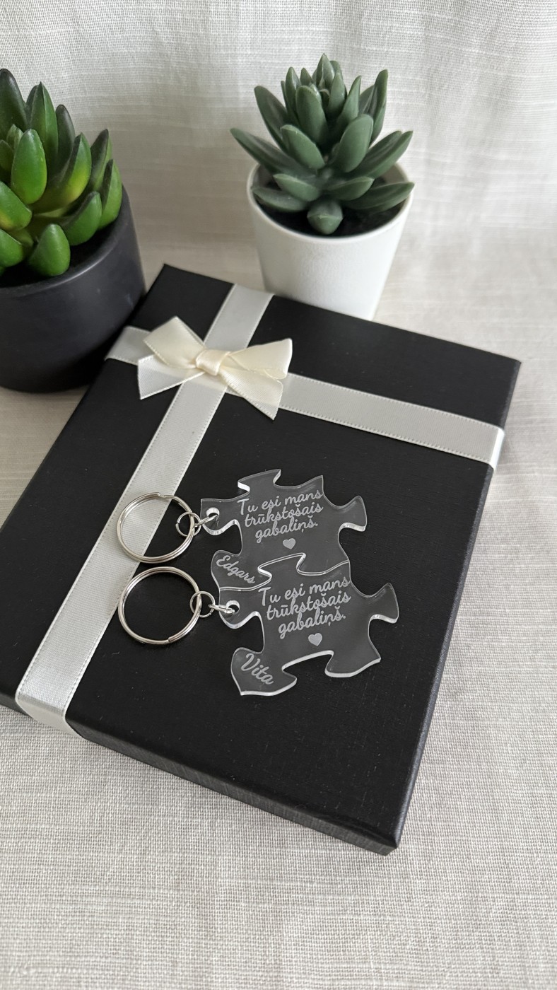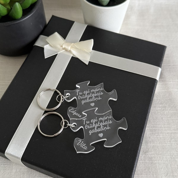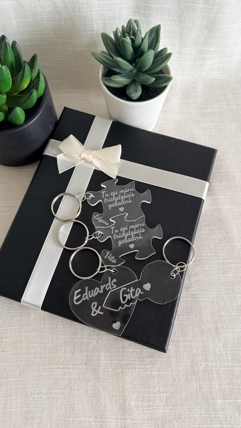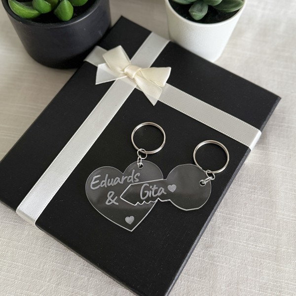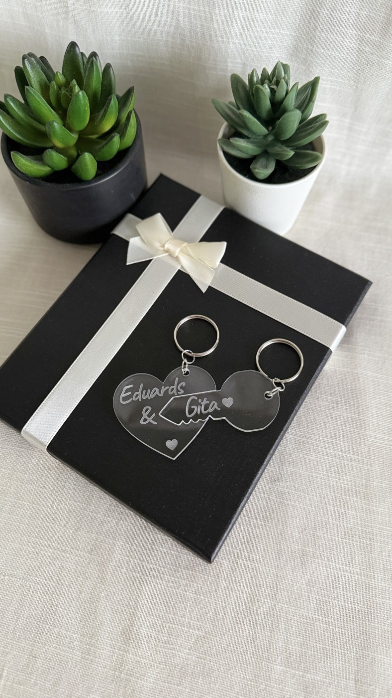 Elegants un sirsnīgs personalizēts atslēgu piekariņu komplekts, kas radīts īpašiem mirkļiem. Komplektā ietilpst 2 akrila atslēgu piekariņi – viņam un viņai, padarot to par lielisku dāvanu pāriem, jubilejām, kāzām vai Valentīna dienai.