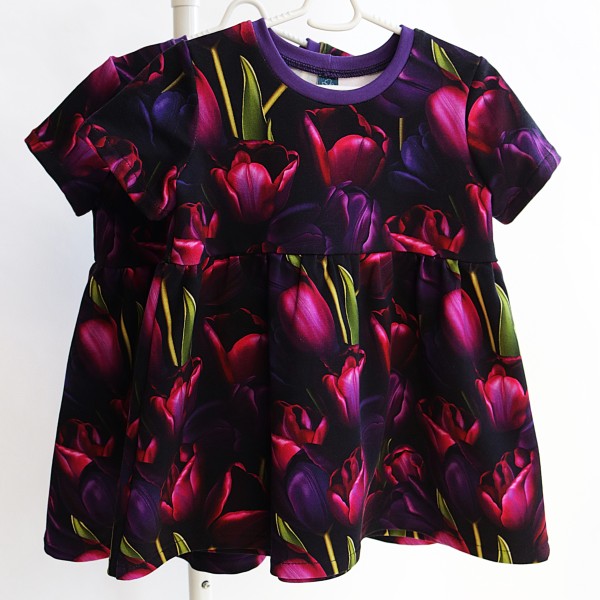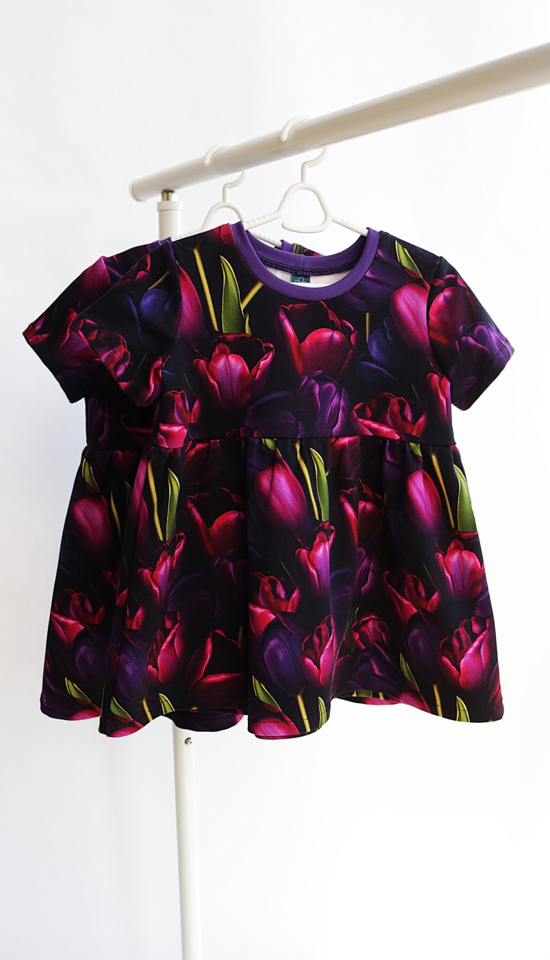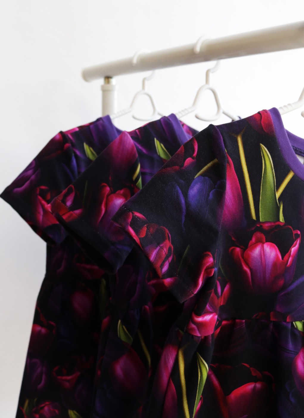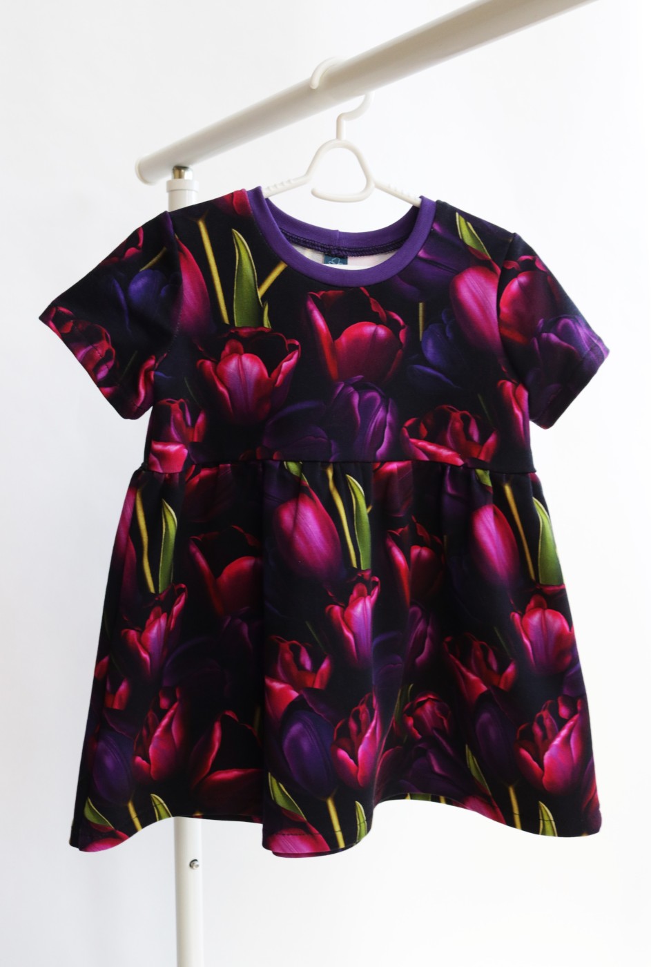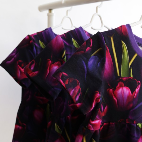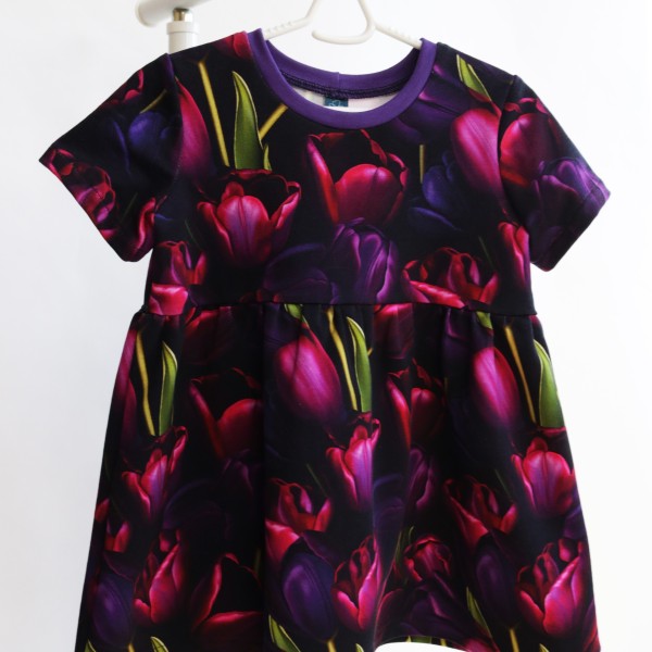 Kokvilnas cilpiņtrikotāžas kleita ar tulpju rakstu.