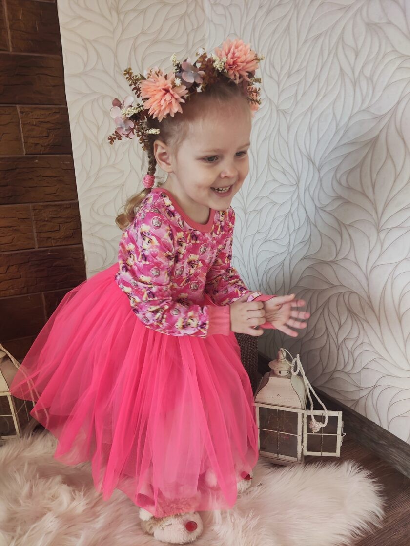 Kleita šūta no augstas kvalitātes kokvilnas cilpiņtrikotāžas .Kura papildinata ar mirdzosu tillu (tills ar zelta spīdumiem)