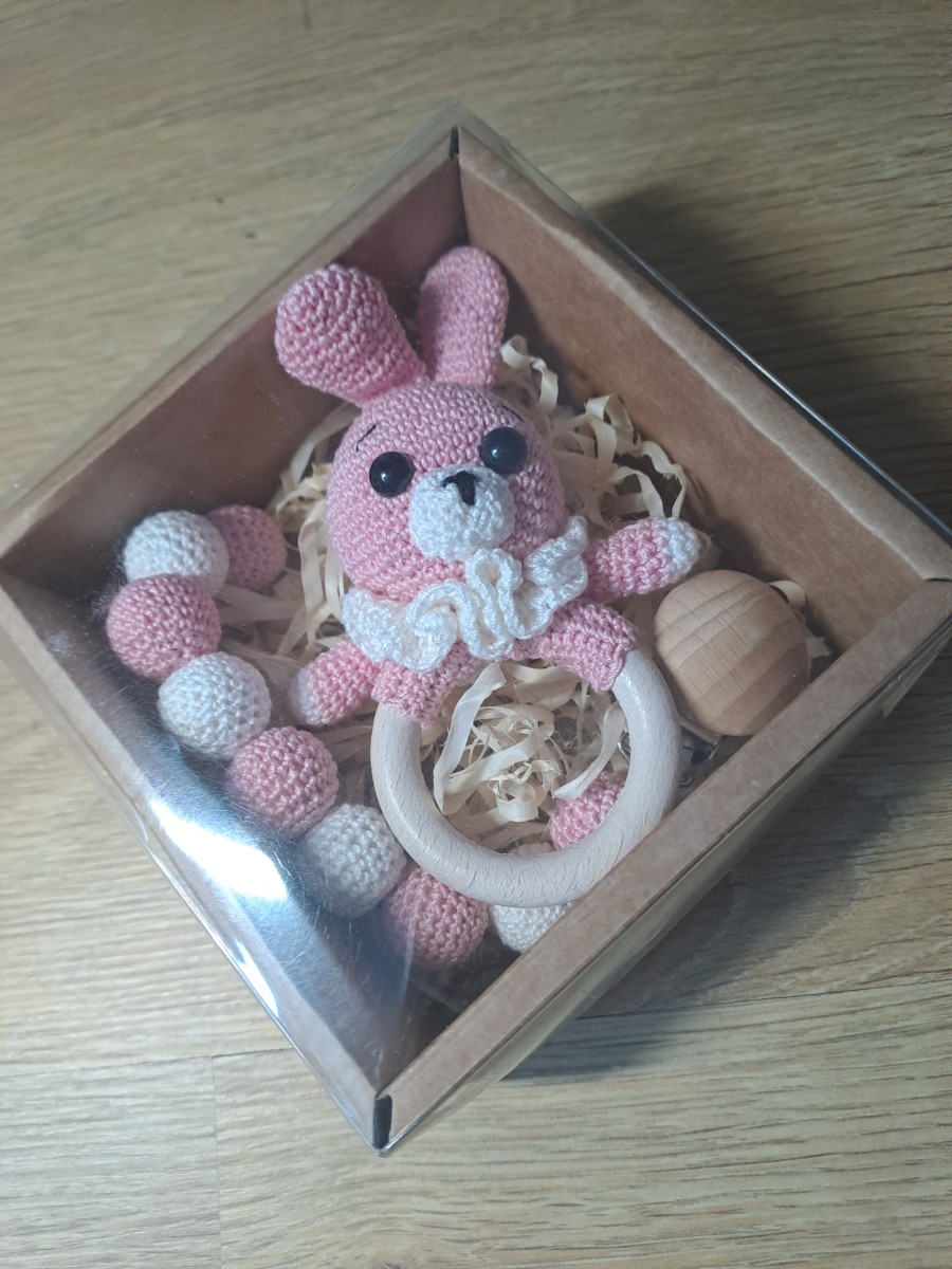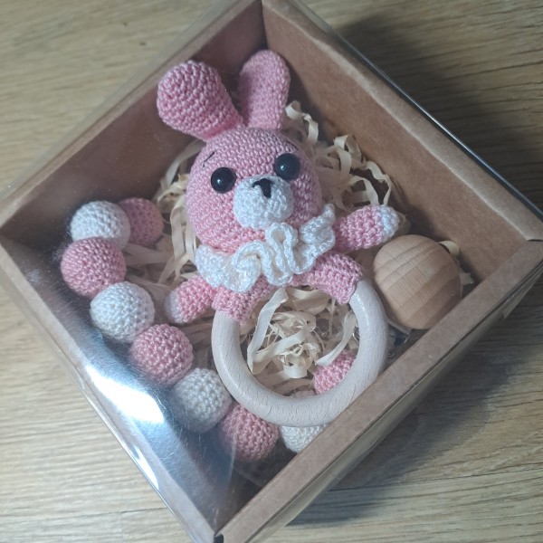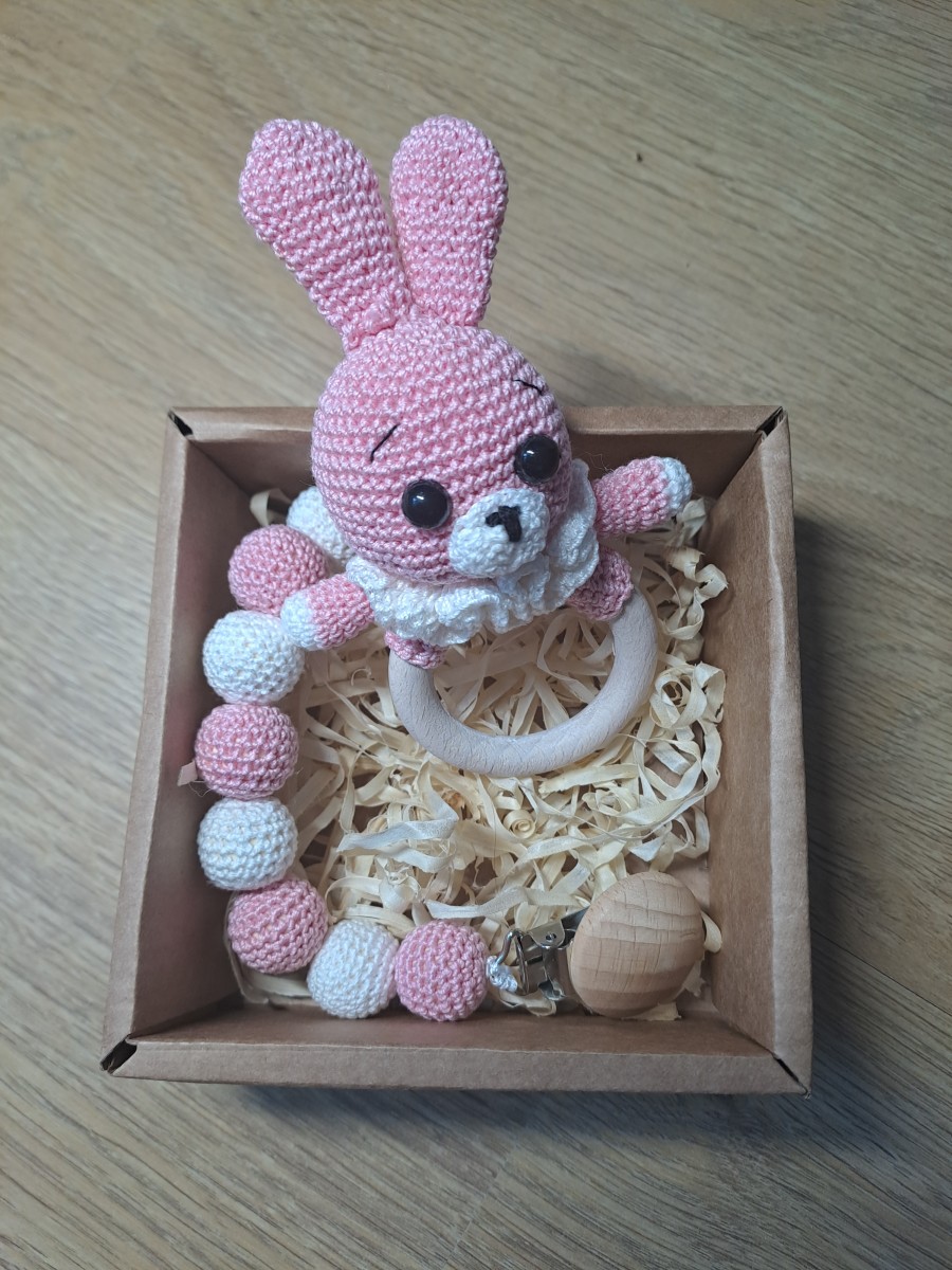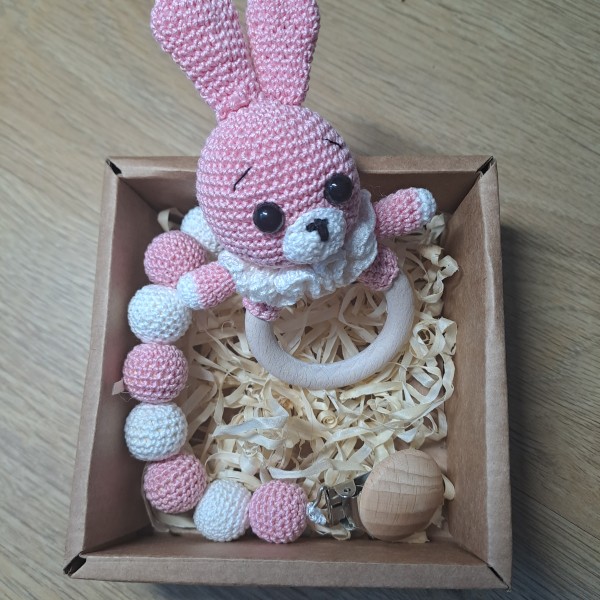 Šis dāvanu komplekts sastāv no zaķa formas grabulīša un knupīša turētāja. Tas ir iepakots dāvanu kastītē.