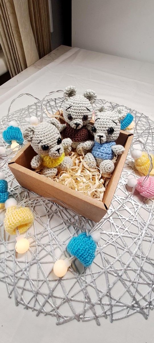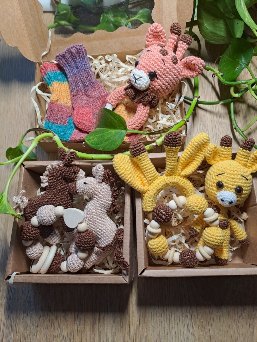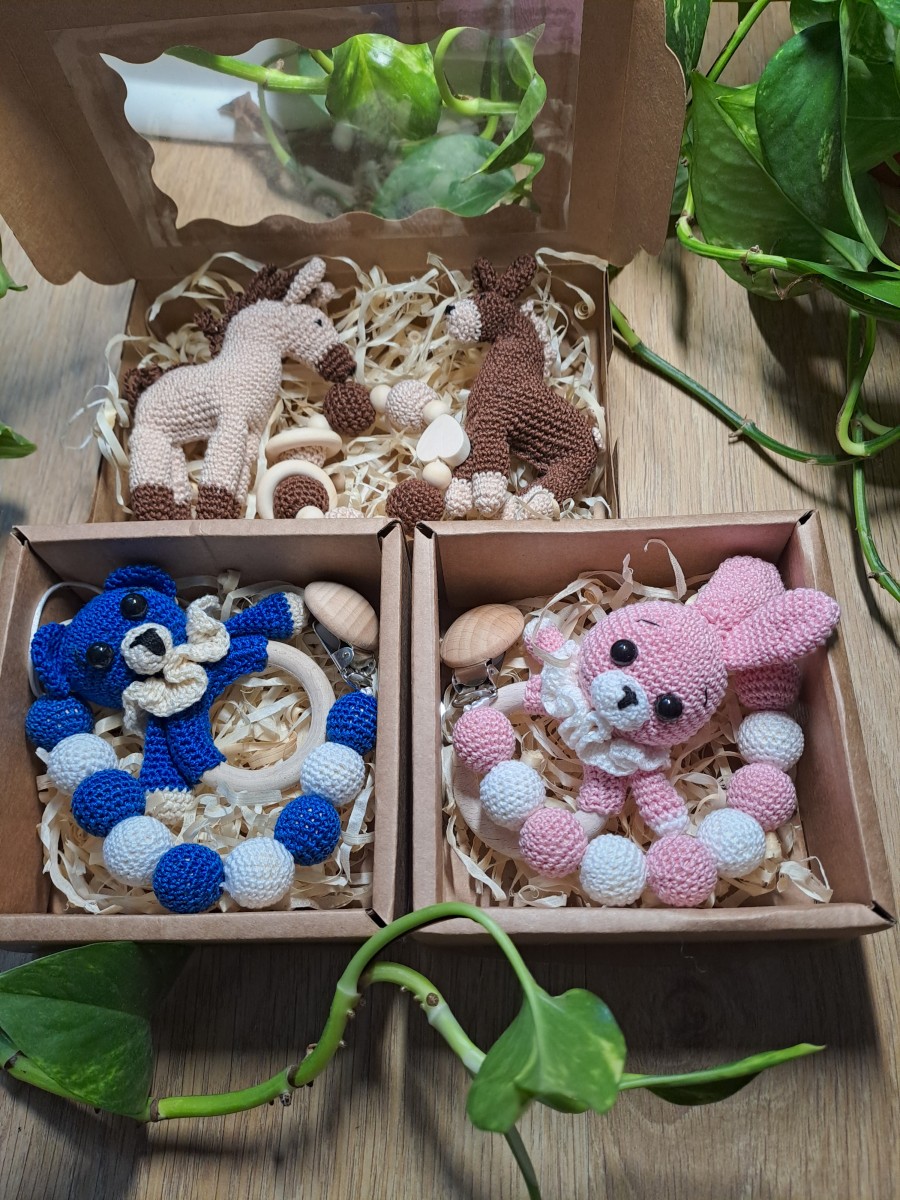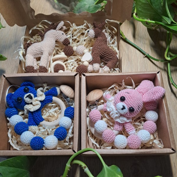 Dāvanu komplektā ietilpst rotaļlieta, knupīša turētājs un zobu nākšanas rotaļlieta. Visi materiāli ir dabīgi.