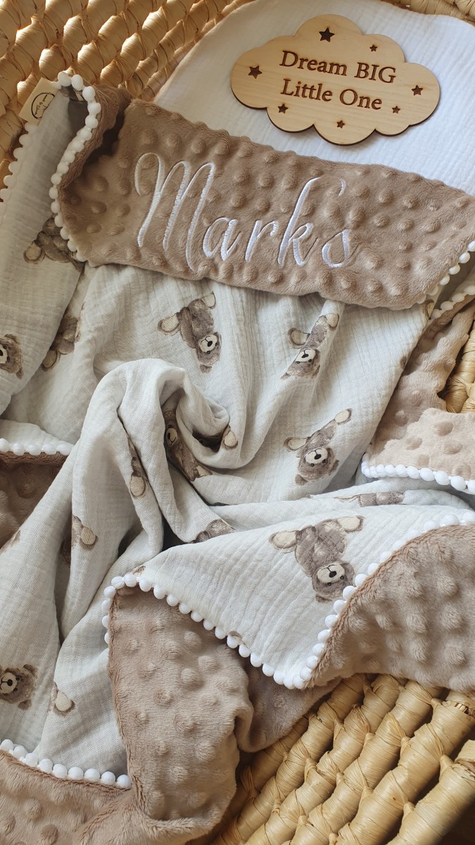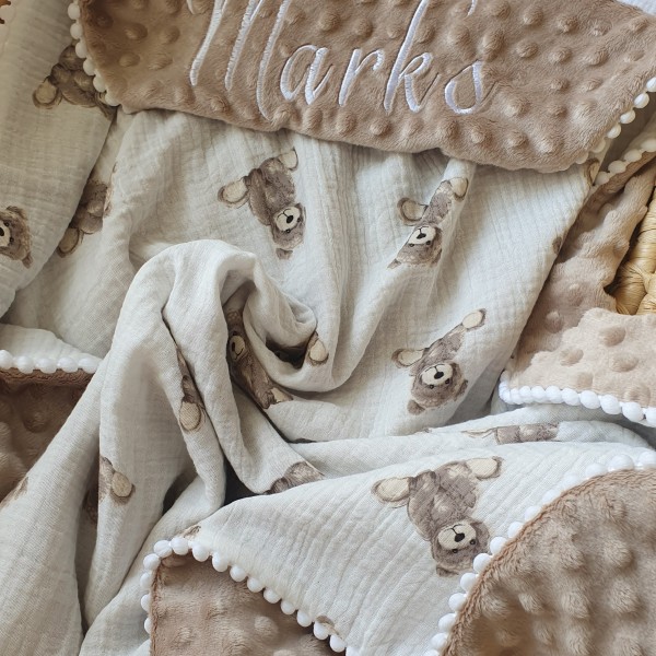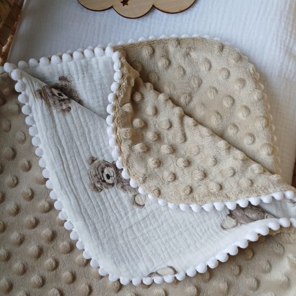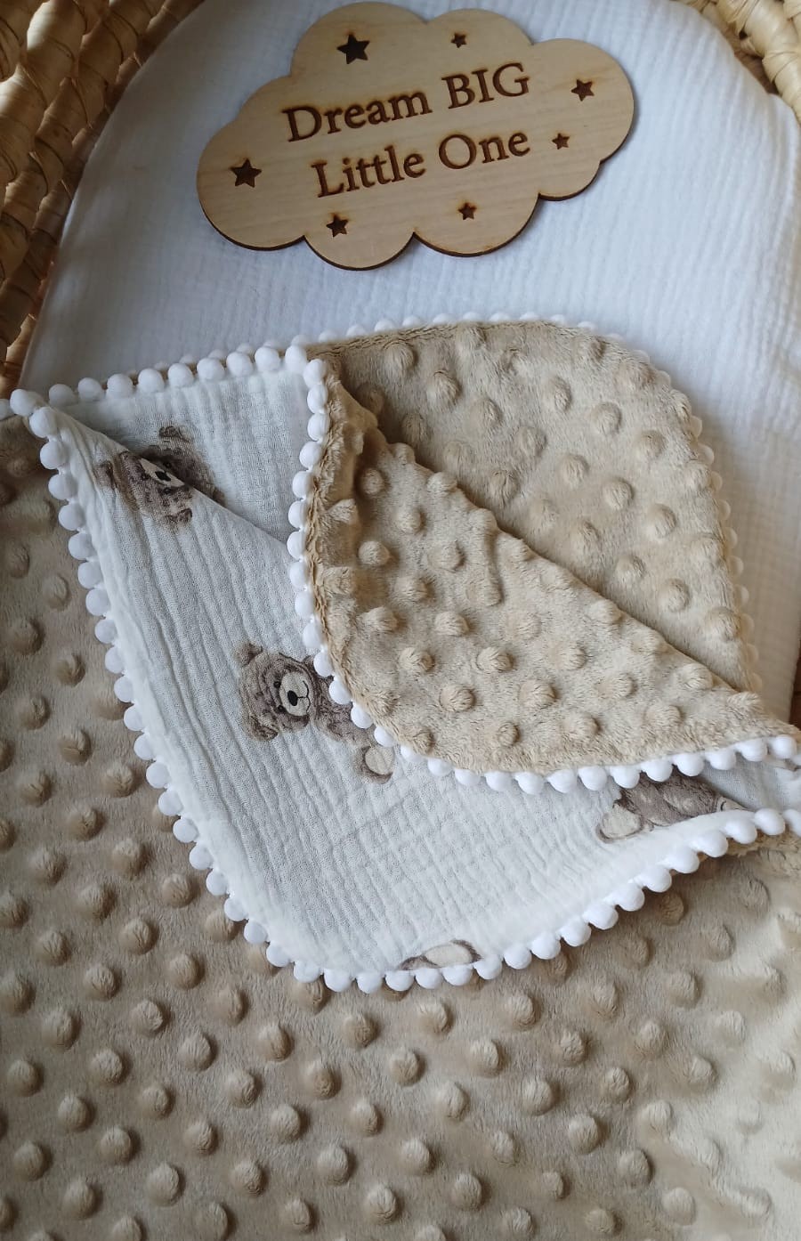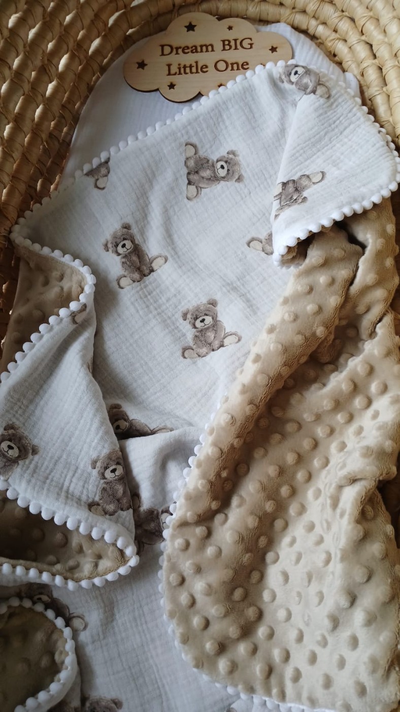 Mazuļu sedziņa, kas darināta īpaši piedomājot par mazulīša komfortu! Divpusēji izmantojama sedziņa, kas sastāv no augstas kvalitātes mīksta, sildoša un elpojoša Teddy audumiņa un ļoti mīkstā kokvilnas muslīna. Abi audumi ir lieliski piemēroti mazuļa maigajai ādai. Sedziņa nesviedrē, tā ir viegla un ļoooti patīkama pieskārienam... ak laimīgie mūsdienu bēbīši, kuri var izgulēt savus miedziņus mīkstās un maigās sedziņās :)