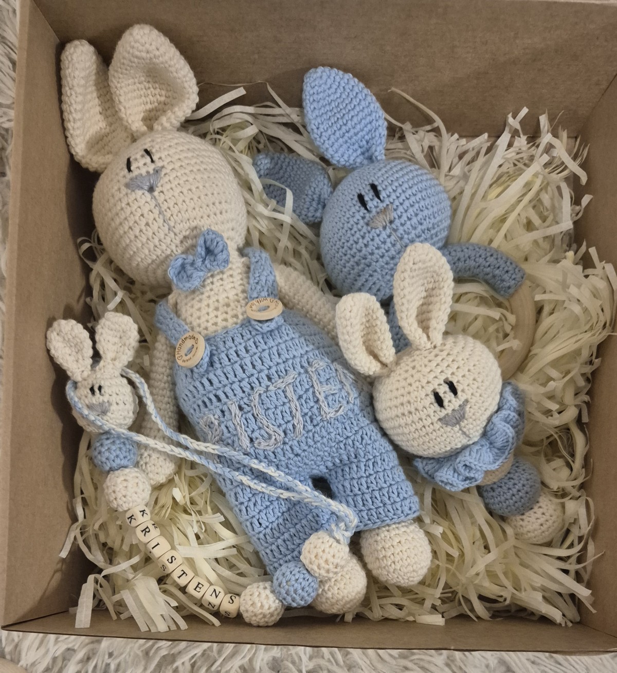 Komplektiņā ietilpst-2gab.grabulīši,knupīša turētājs,mantiņa zaķēns