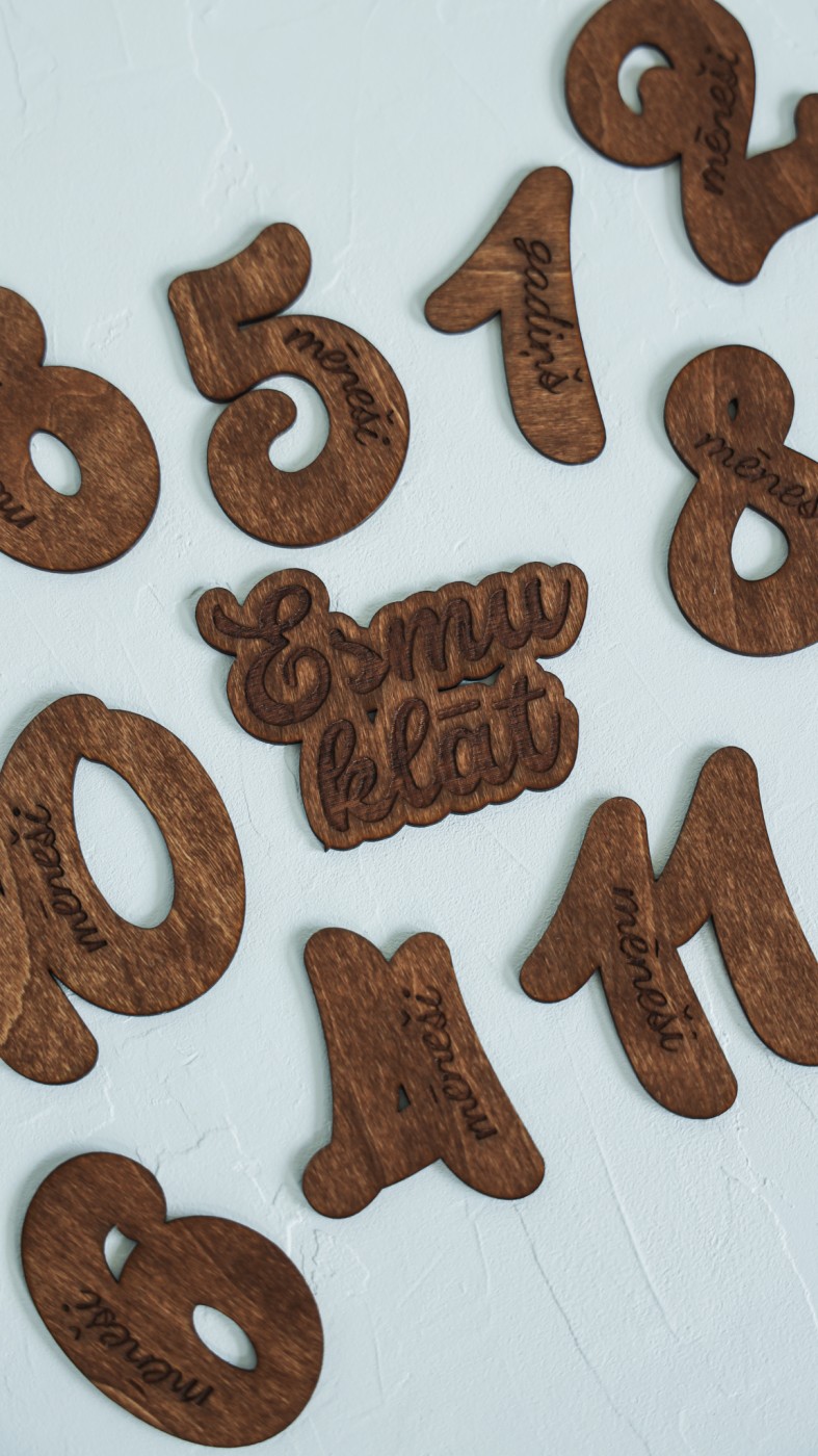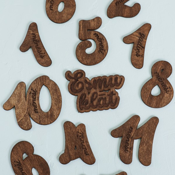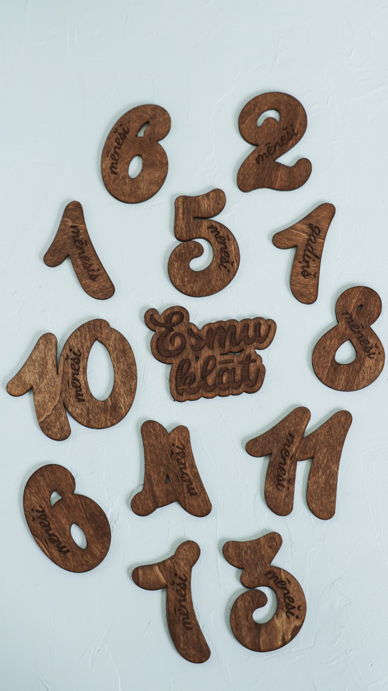 Koka cipariņi lieliski noderēs, iemūžinot mazulīša augšanu pirmajā dzīves gadā. 🌿 Komplektā 12 cipari un uzraksts “Esmu klāt”.