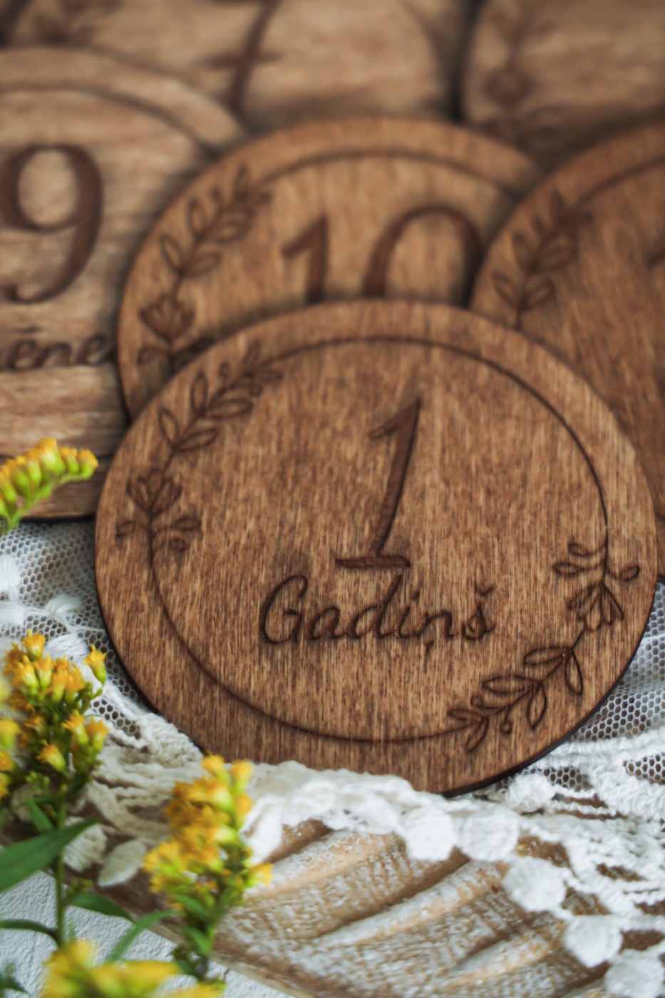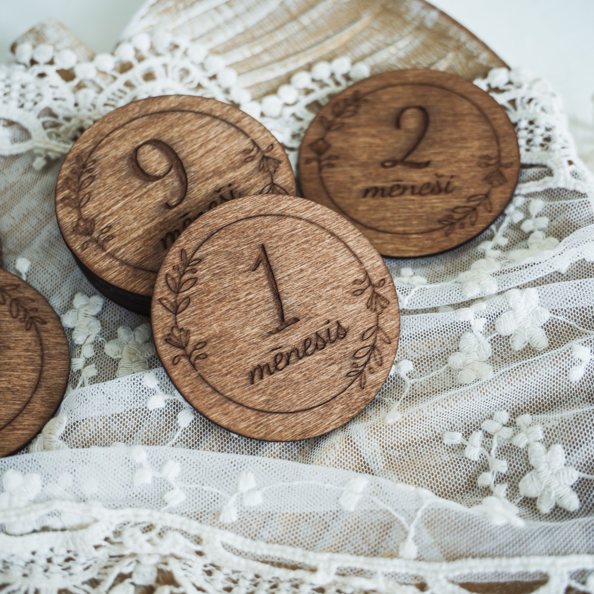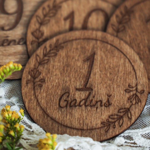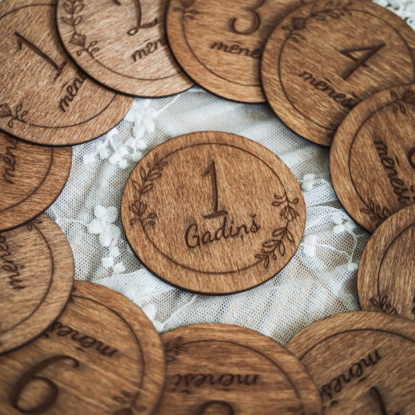 Smalks ziedu rāmīša gravējums piešķir šīm koka mēneša kartītēm romantisku un maigu noskaņu. 🌸 Katrs aplītis ir kā mazs mākslas darbs, kas mazulīša bildītēm piešķirs īpašu siltumu.
