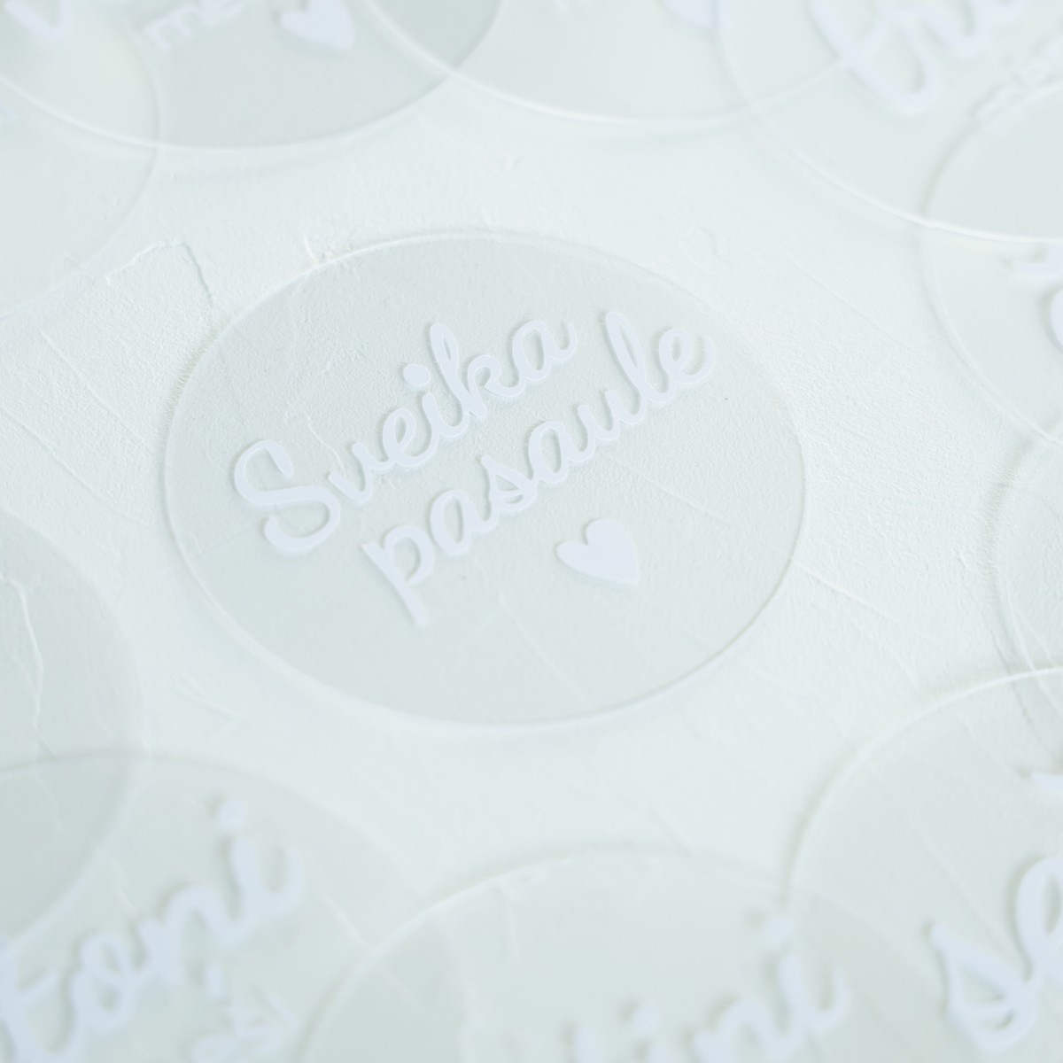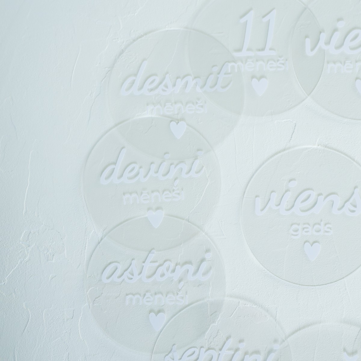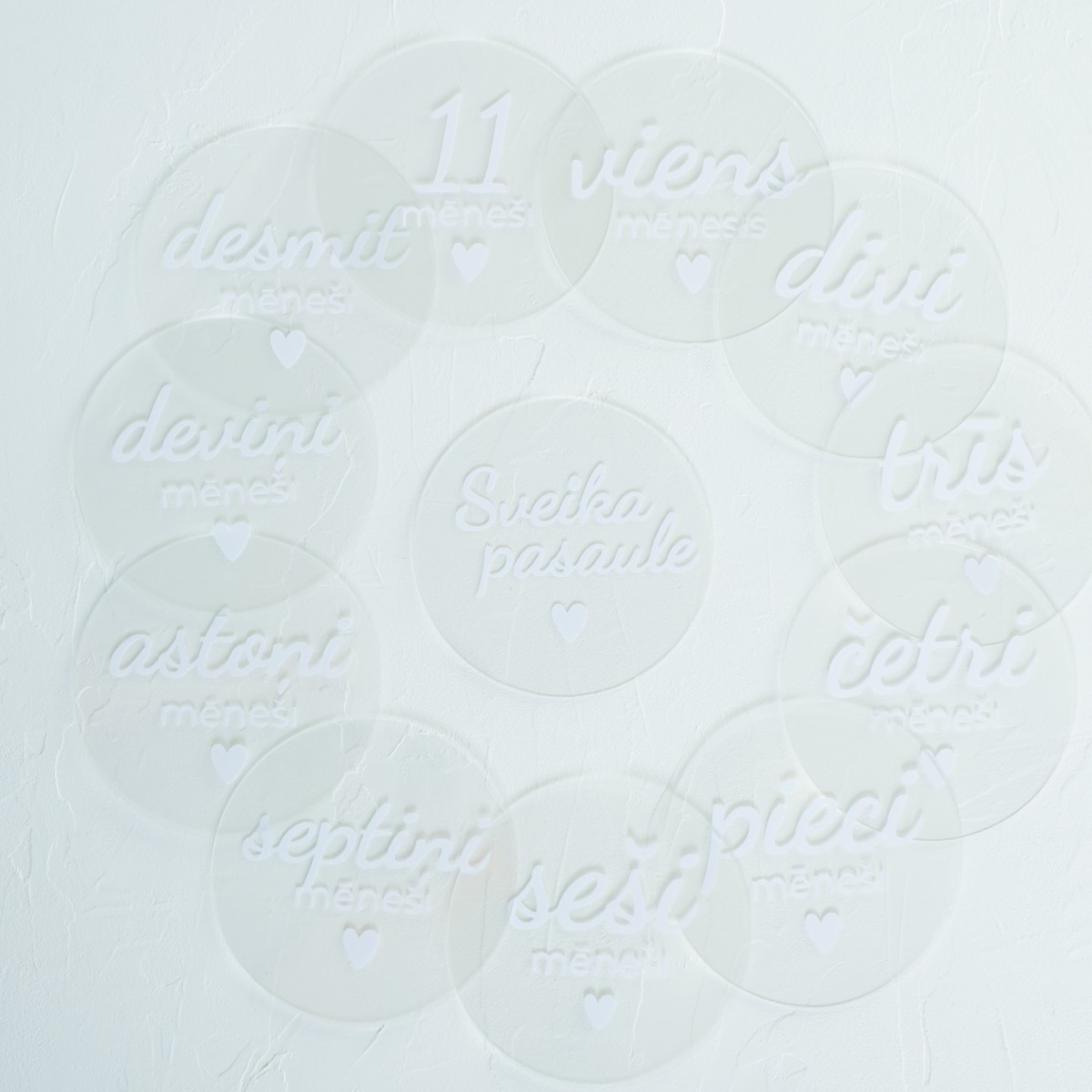 Minimālistiski, caurspīdīgi organiskā stikla aplīši ar baltiem burtiem - tīrs un mūsdienīgs dizains, kas iederēsies jebkurā fotosesijā. ✨ Šīs kartītes palīdzēs radīt estētiskas un harmoniskas bildes.