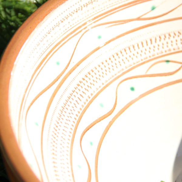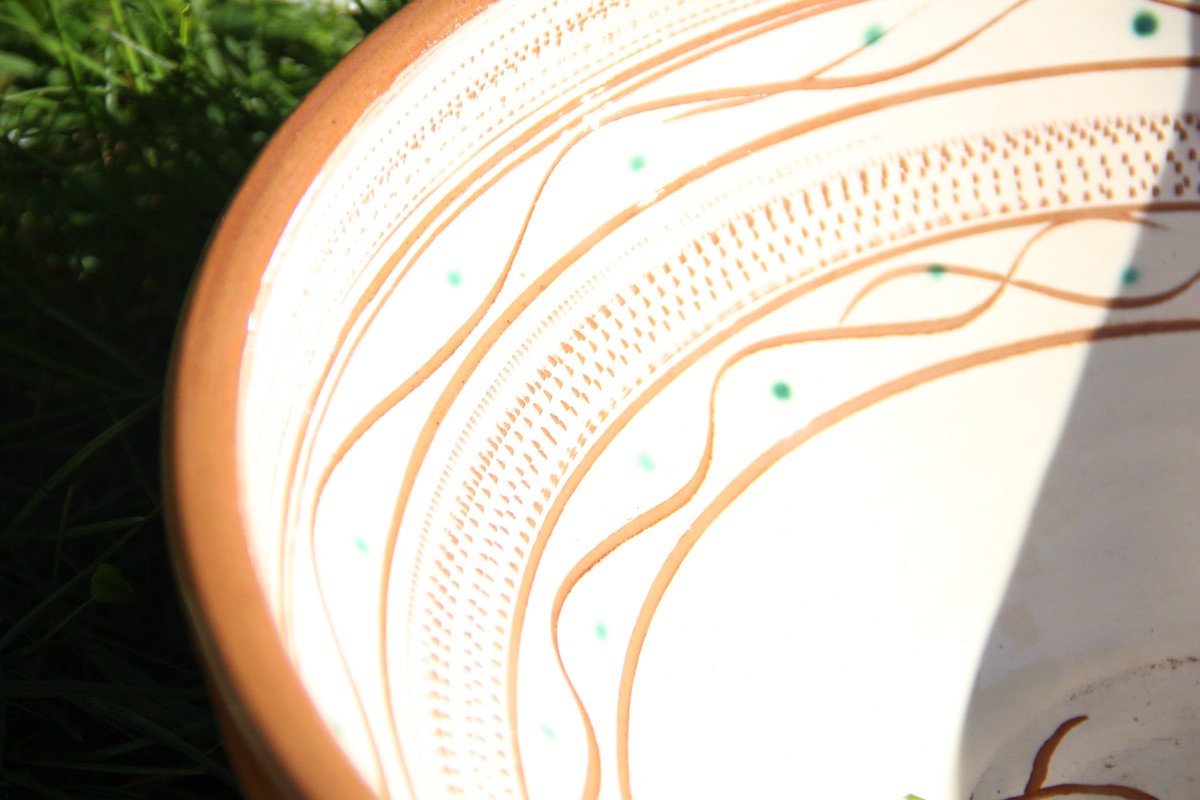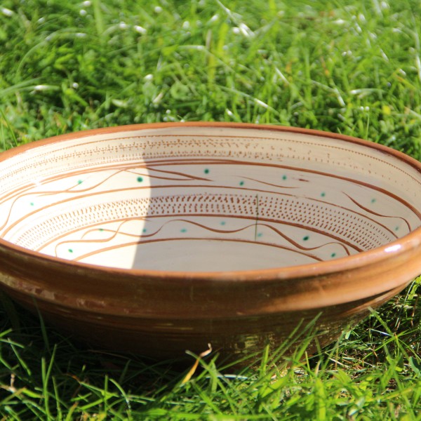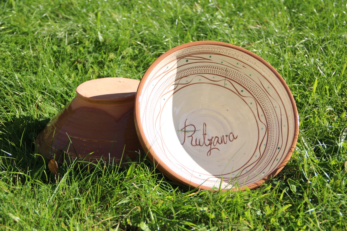 Bļoda rokām virpota uz kājsperemās virpas no Latvijas, Raunas brūnā māla. Tā ir darināta, rotāta pamatojoties uz vietējiem tradicionālajiem paņēmieniem Rucavā.. Tā sver 2,4 kg un augšējā diametrā ir 33,5 cm.