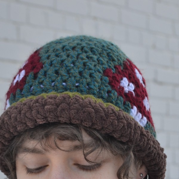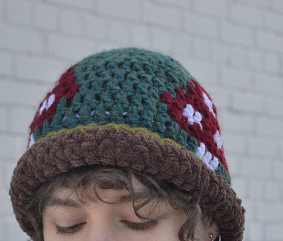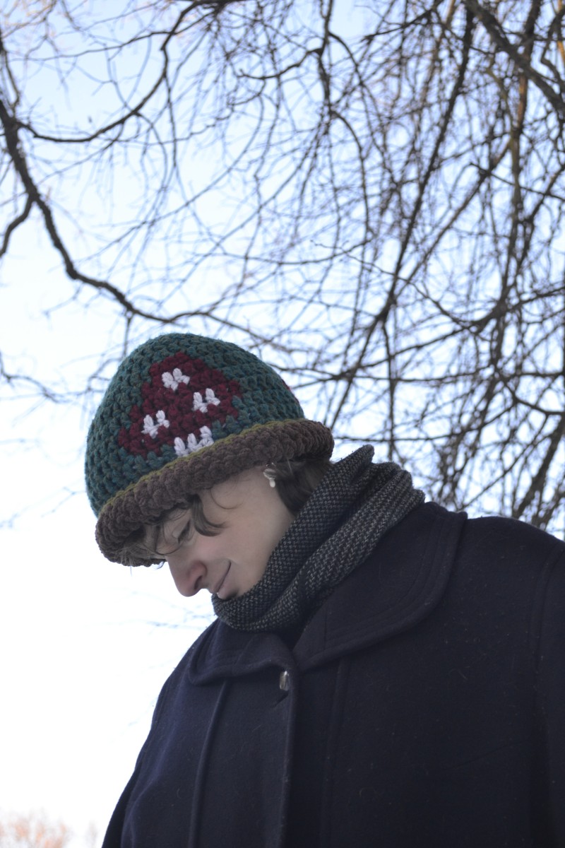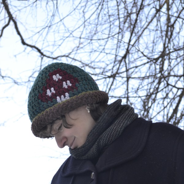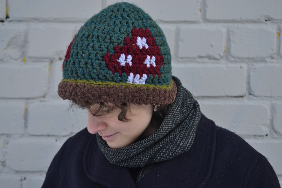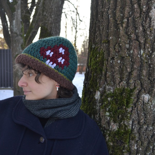 pūkaina brūnās dzijas zemīte, kuras sūniņās paslēpušās trīs mušmirītes, un tas viss – uz cepures!