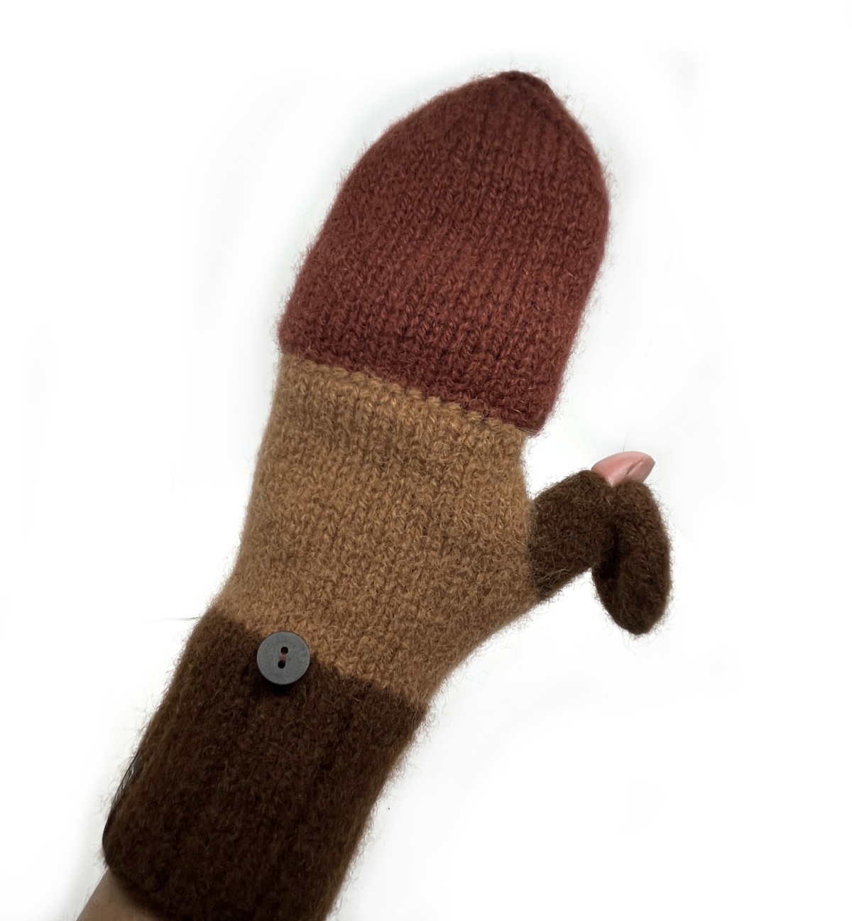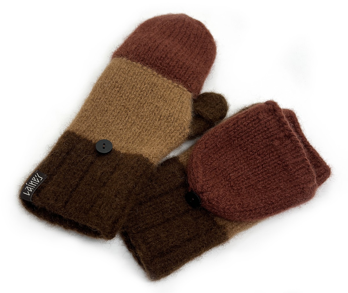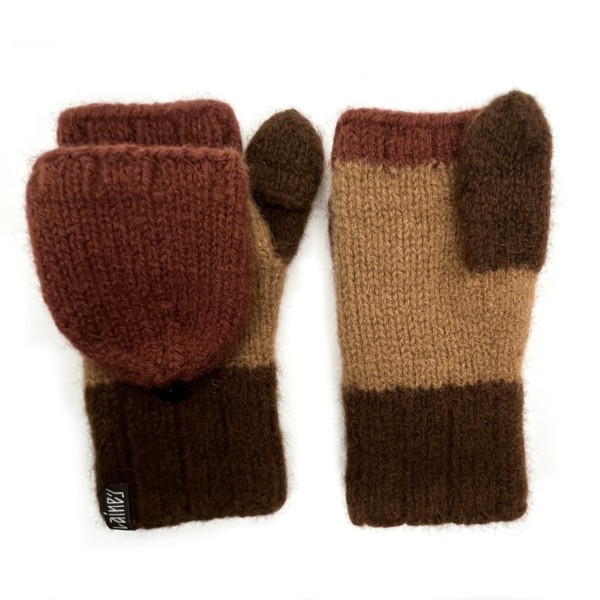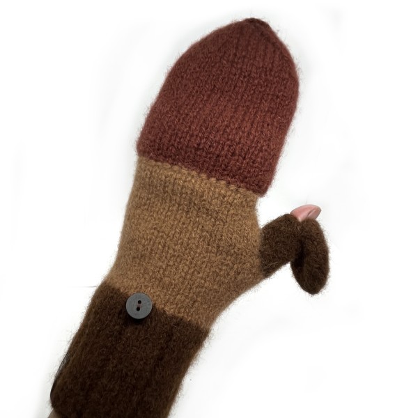 Cimdi ir adīti ar rokām no 100% dabīgas aitas vilnas un pēc tam filcēti, lai iegūtu īpašu blīvumu, siltumu un izturību. Filcēšanas process padara cimdus īpaši piemērotus aukstam laikam - tie labi saglabā siltumu un pasargā rokas no vēja. Praktiska detaļa ir noņemamie dūraiņu gali, kas ļauj ērti pielāgot cimdus dažādām situācijām - nepieciešamības gadījumā var atsegt pirkstus, piemēram, telefona lietosanai vai sīkākiem darbiem, nezaudējot plaukstu siltumu. Gali tiek nostiprinati ar dekorativu pogu, kas vienlaikus kalpo kā dizaina akcents.