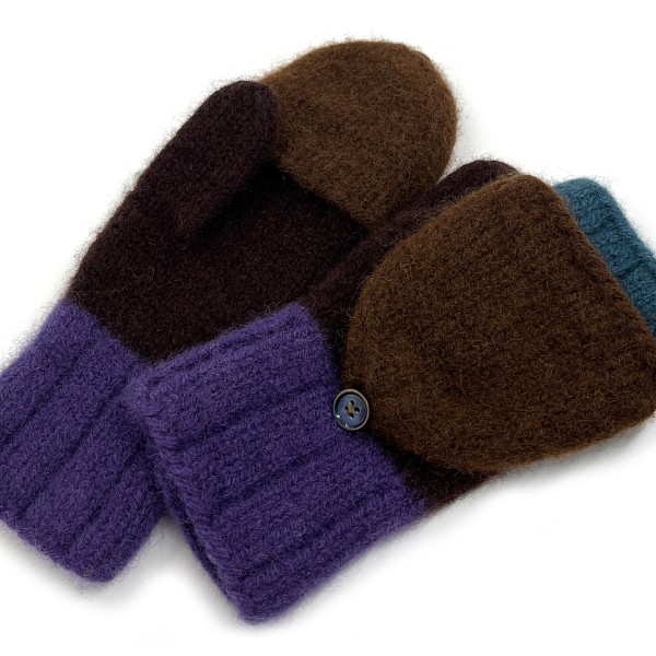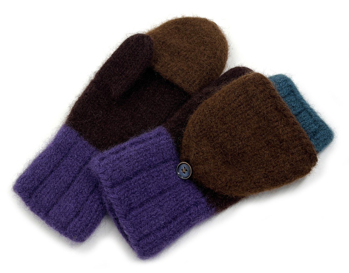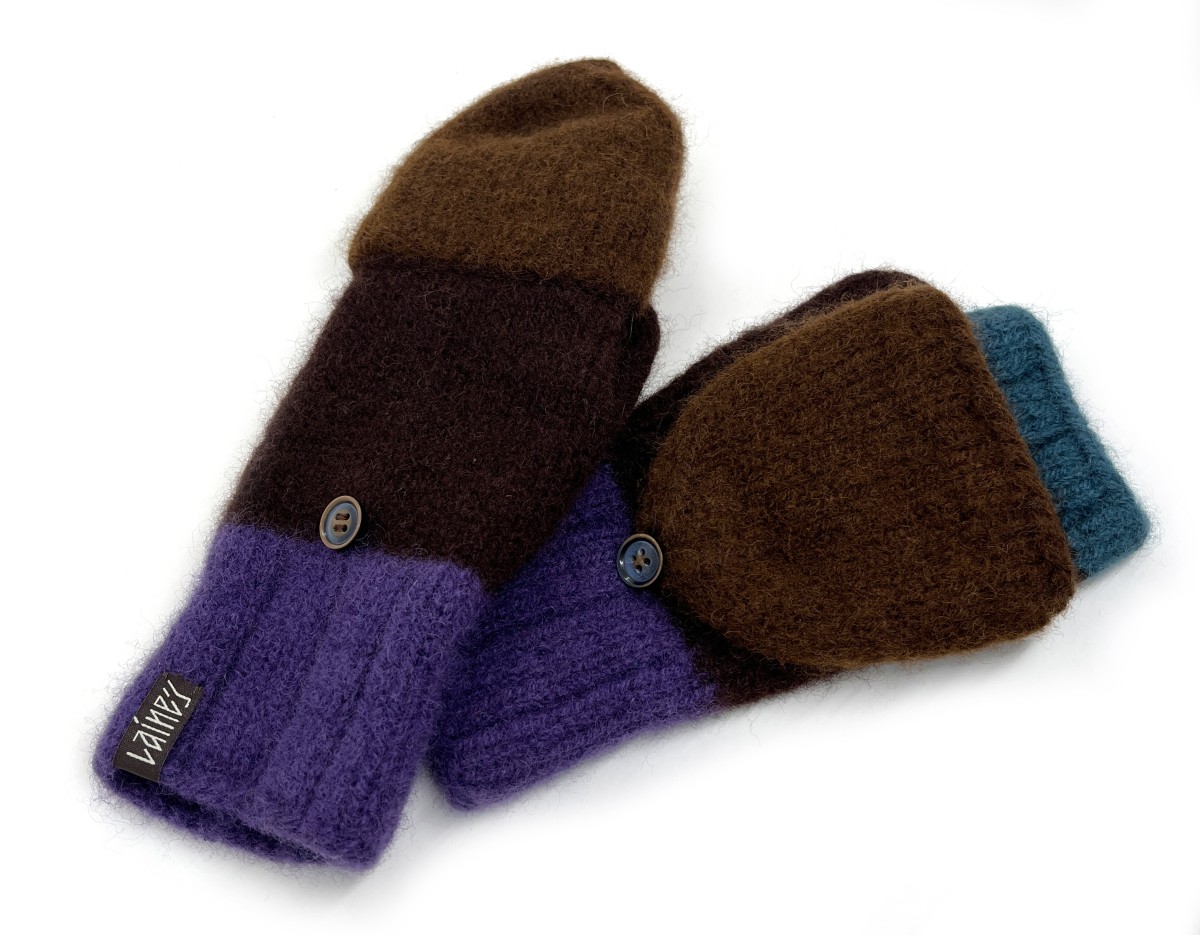 Cimdi ir adīti ar rokām no 100% dabīgas aitas vilnas un pēc tam filcēti, lai iegūtu īpašu blīvumu, siltumu un izturību. Filcēšanas process padara cimdus īpaši piemērotus aukstam laikam - tie labi saglabā siltumu un pasargā rokas no vēja. Praktiska detaļa ir noņemamie dūraiņu gali, kas ļauj ērti pielāgot cimdus dažādām situācijām - nepieciešamības gadījumā var atsegt pirkstus, piemēram, telefona lietosanai vai sīkākiem darbiem, nezaudējot plaukstu siltumu. Gali tiek nostiprinati ar dekorativu pogu, kas vienlaikus kalpo kā dizaina akcents.