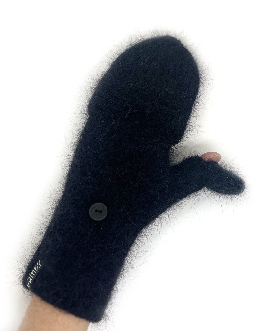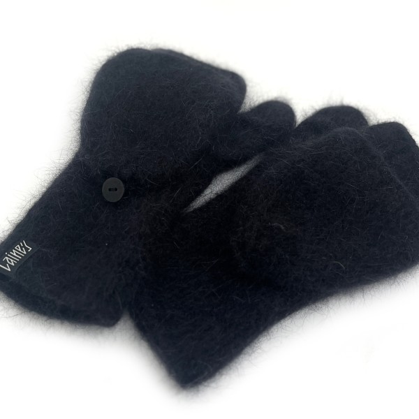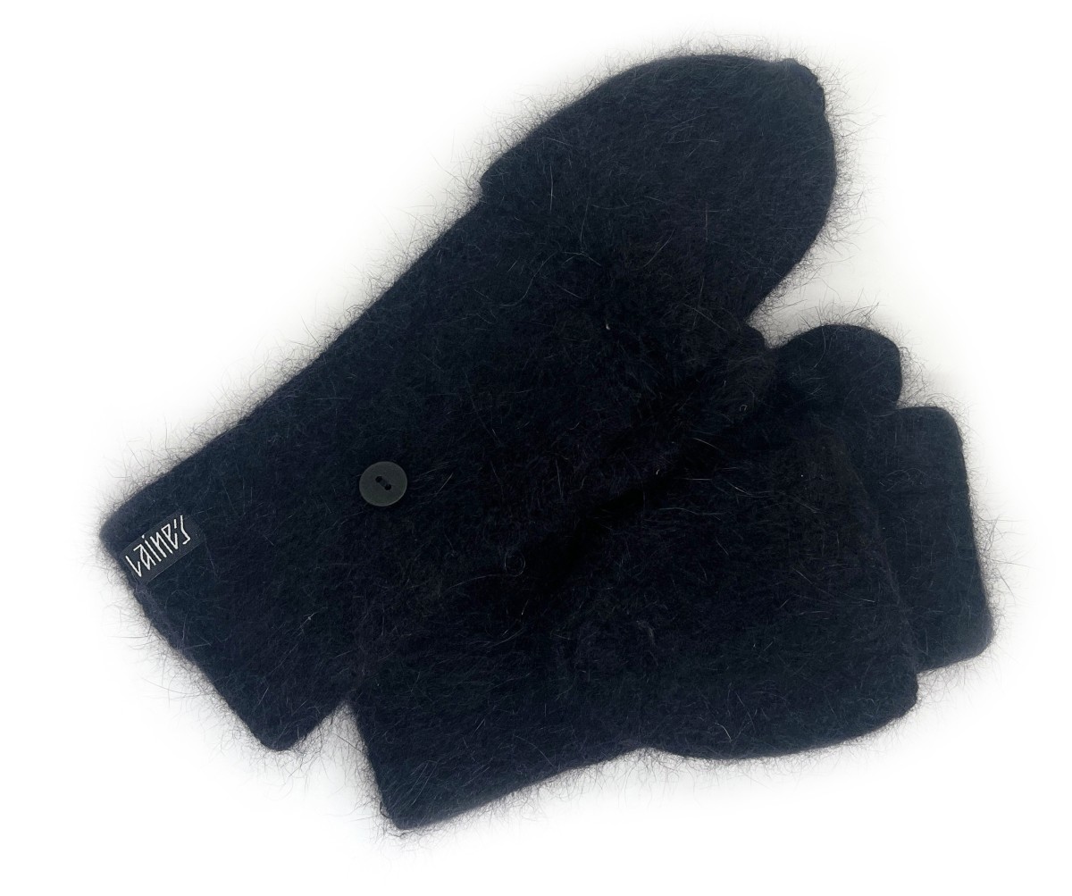 Ar rokām adīti pārveidojami angoras vilnas dūraiņi melnā krāsā