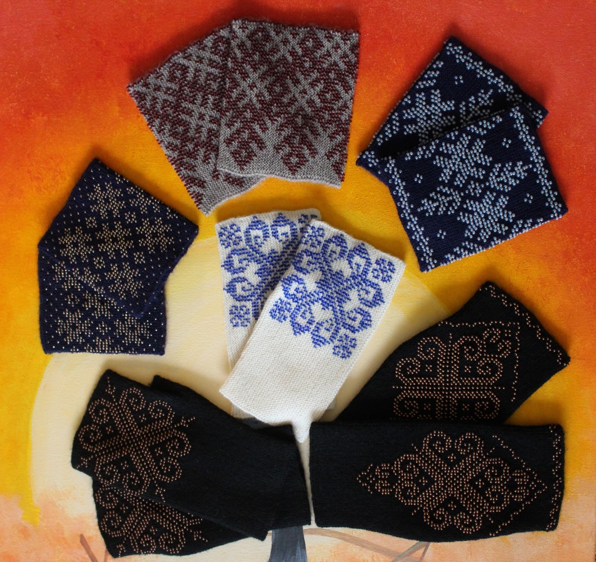 Adītas pērļotas aproces, zilganzaļā krāsā, ar vara krāsas pērlītēm. L izmērs, rokas apkārtmēram 18cm. Garums 11cm.