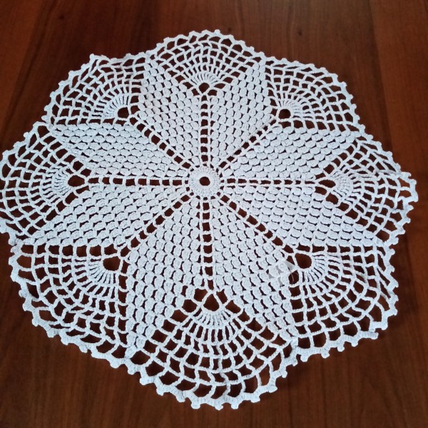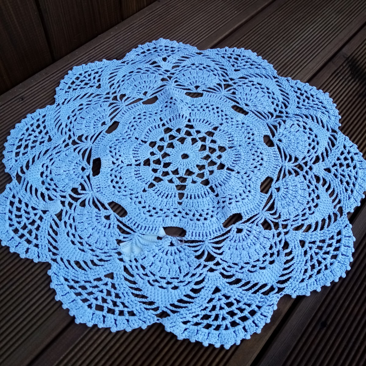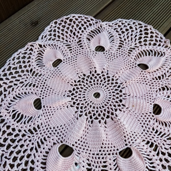 No kokvilnas diegiem tamborētas sedziņas koraļļkrāsā, balta, dzeltena un pelēkzila. Diametrs no 40 cm līdz 48 cm.