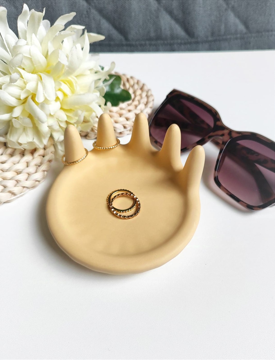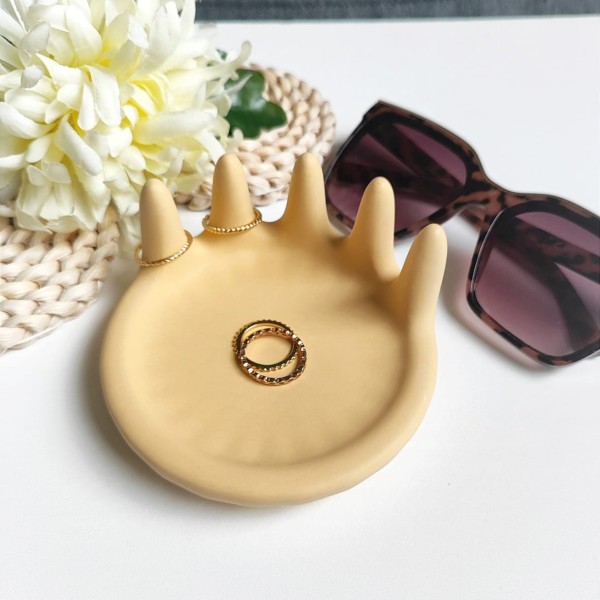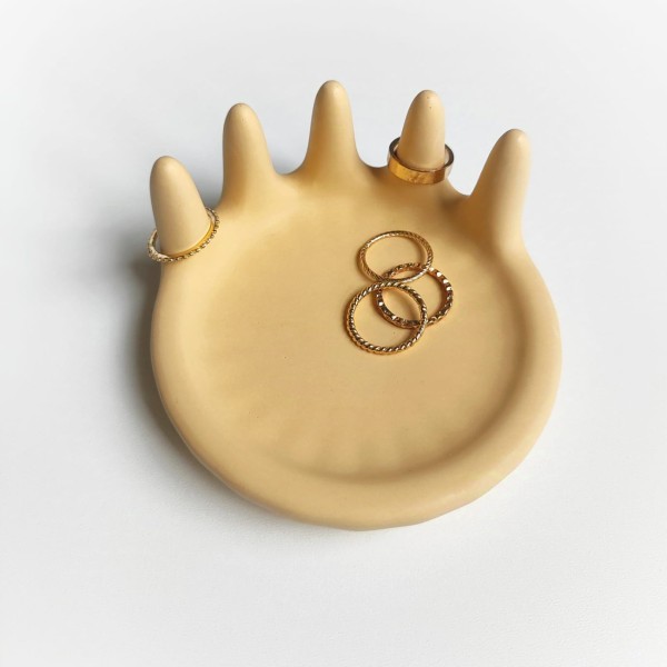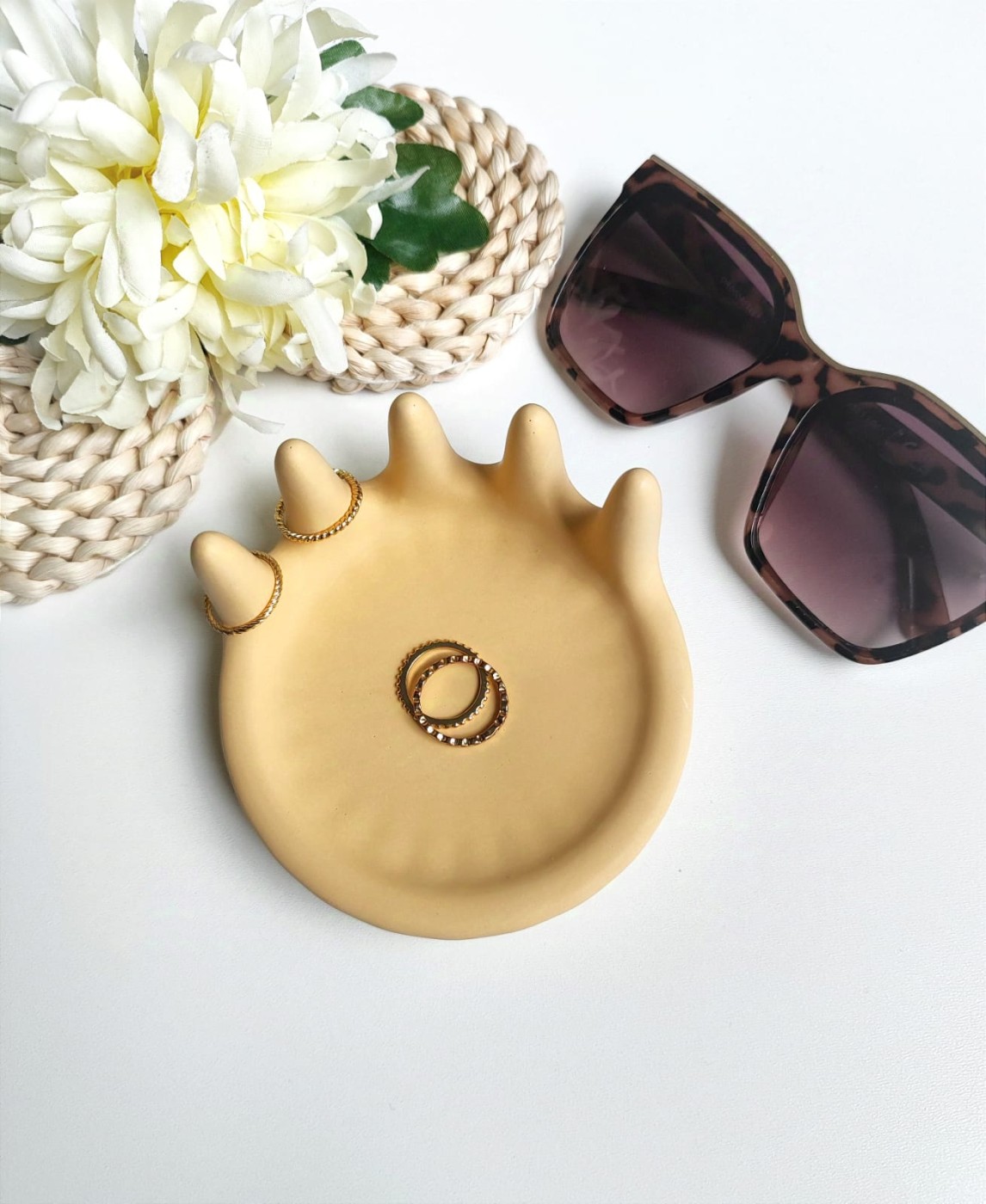 Dekoratīvs trauks dzeltenā krāsā - lieliski piemērots rotu, gredzenu vai citu sīklietu novietošanai.