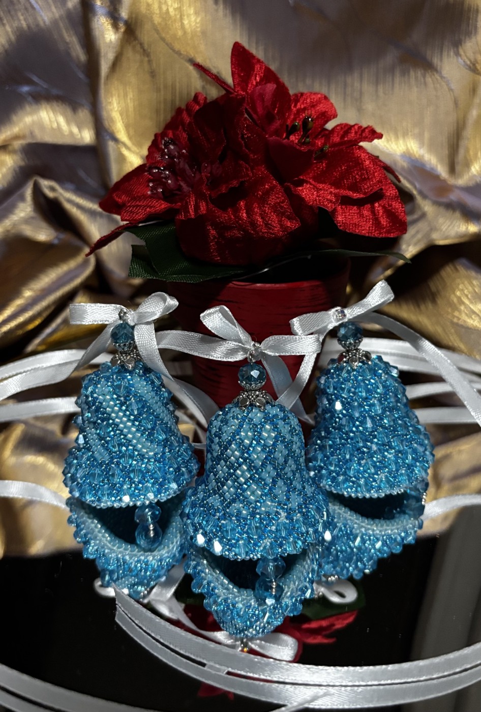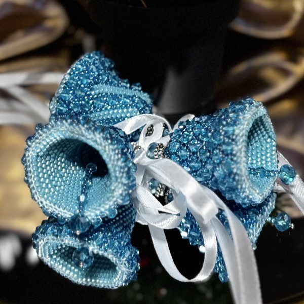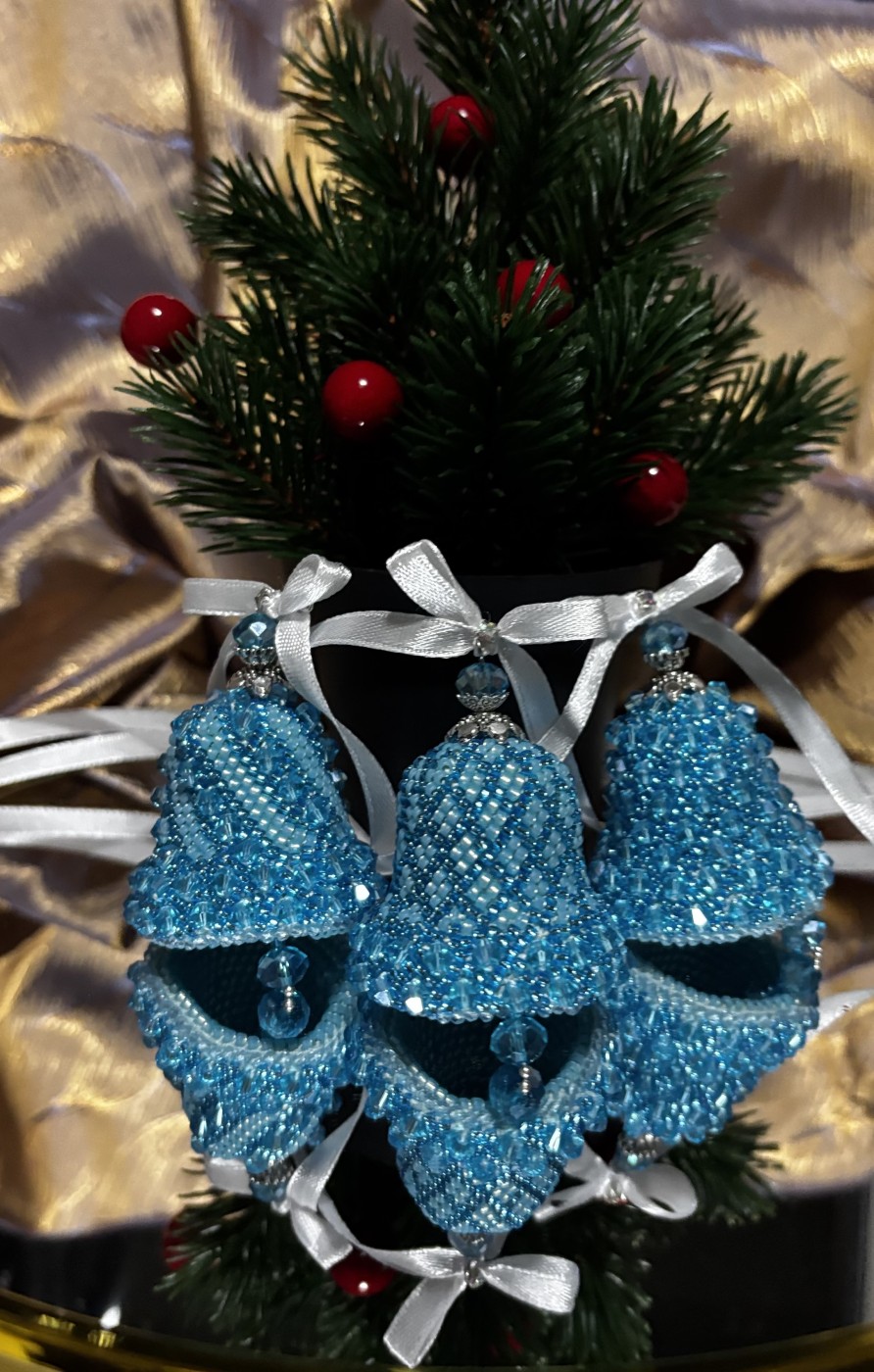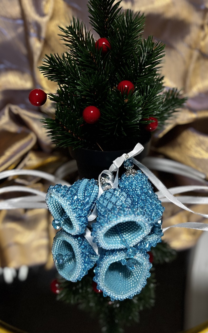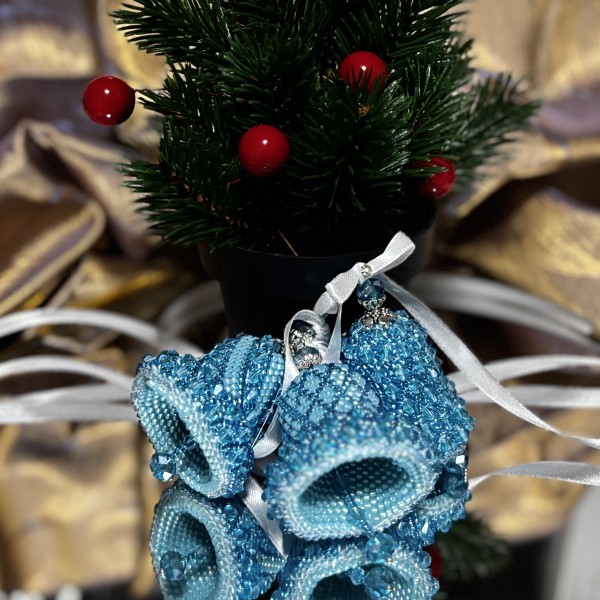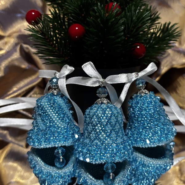 Zvaniņi eglei, kas tamborēti uz kokvilna diega ar sekliņpērlītēm un pērlēm. Komplektā 3 zvaniņi, kas var būt lieliskā dāvana sev vai kādam īpašām cilvēkām.