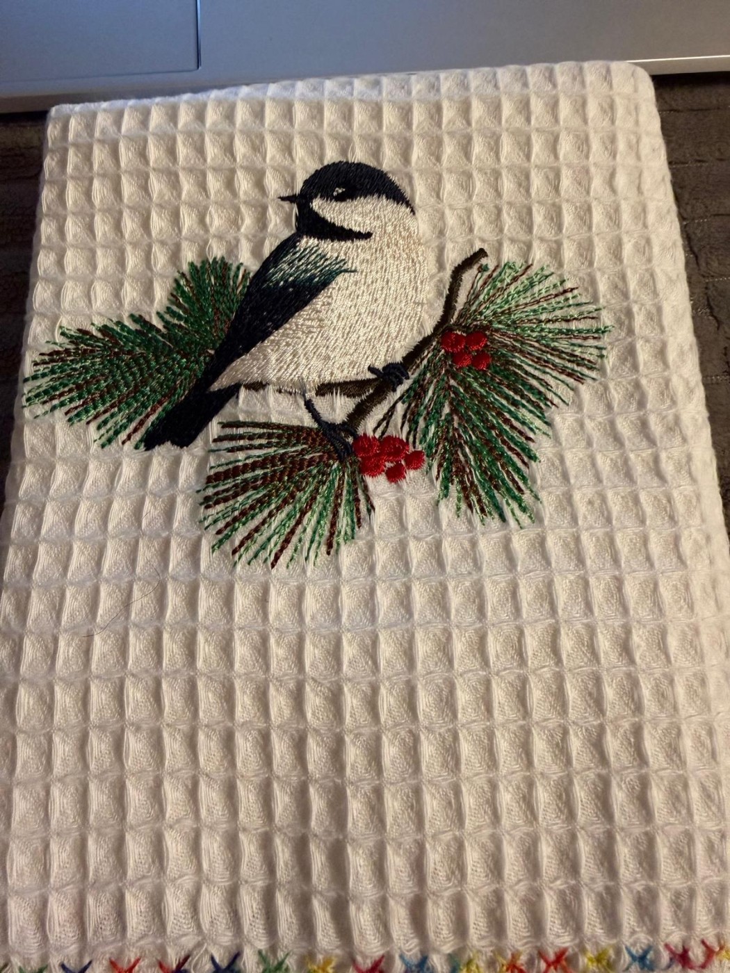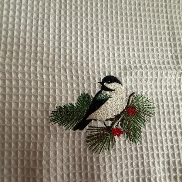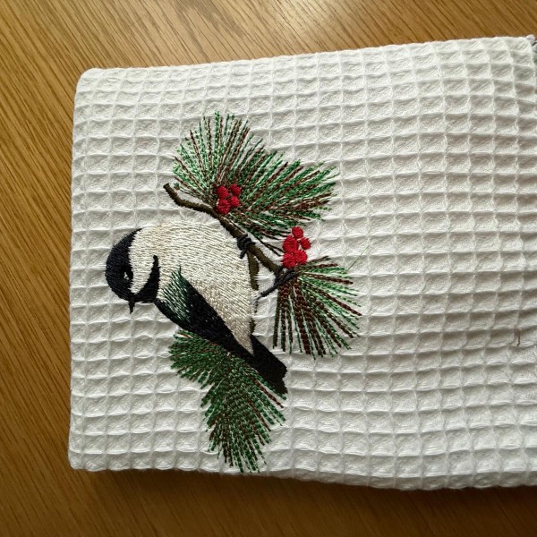 Izšūts virtuves divelis no kokvilnas vafeļauduma.