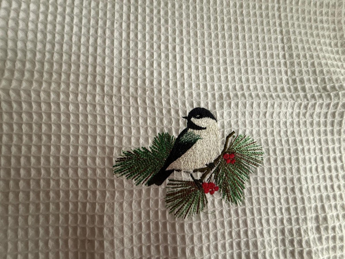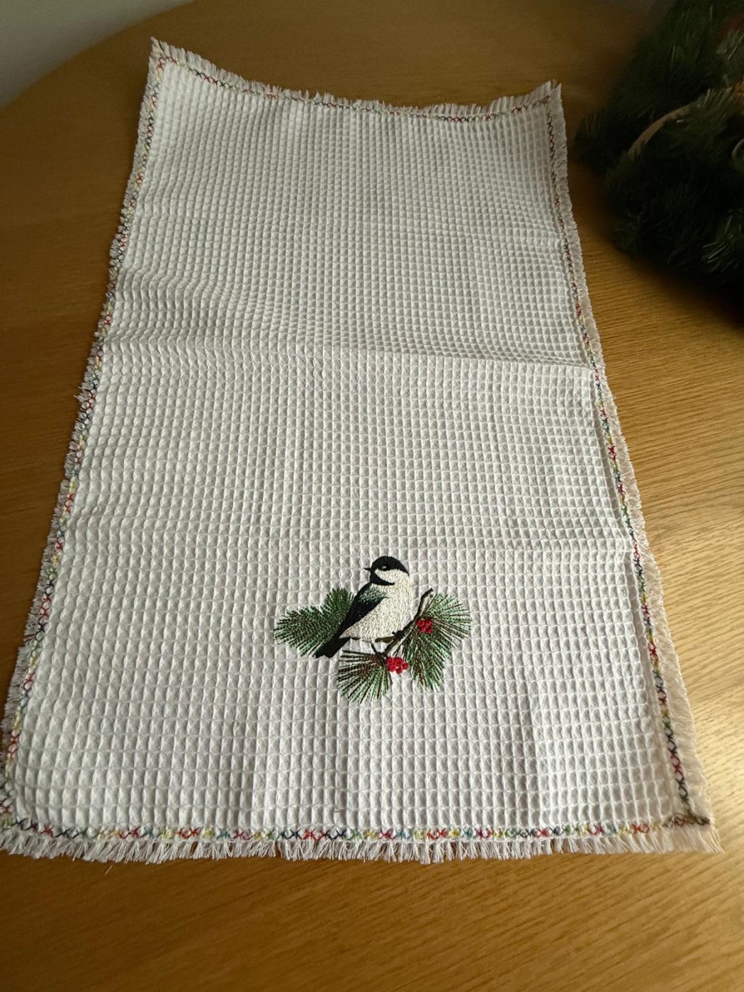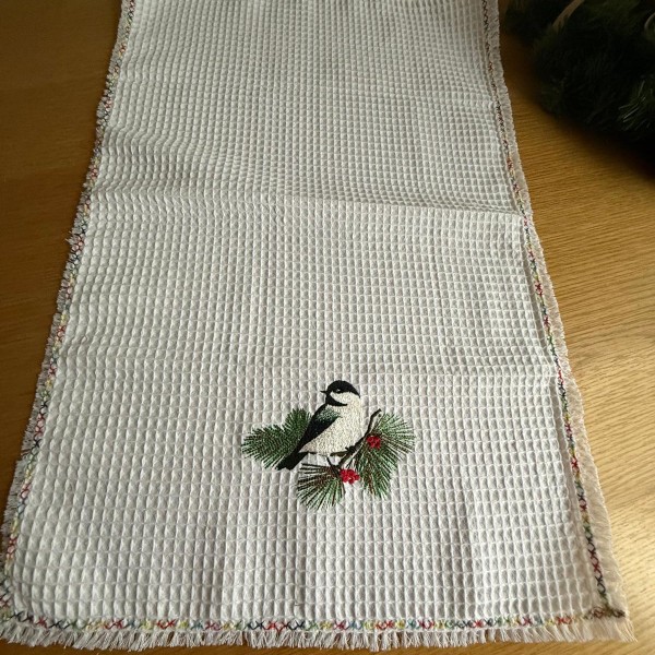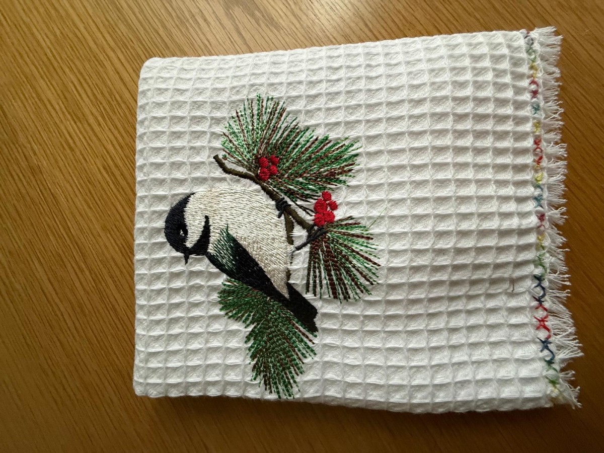 Balts kokvilnas vafeles šūts dvielis baltā krāsā, ar bārkstīm izmērs 38x 60CM . Virsū izšuvums 12X8 cm -zīlīte.