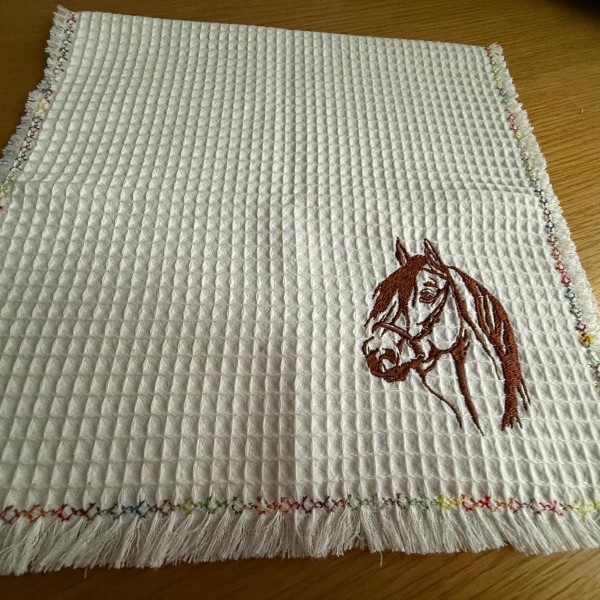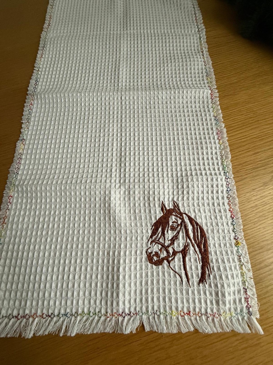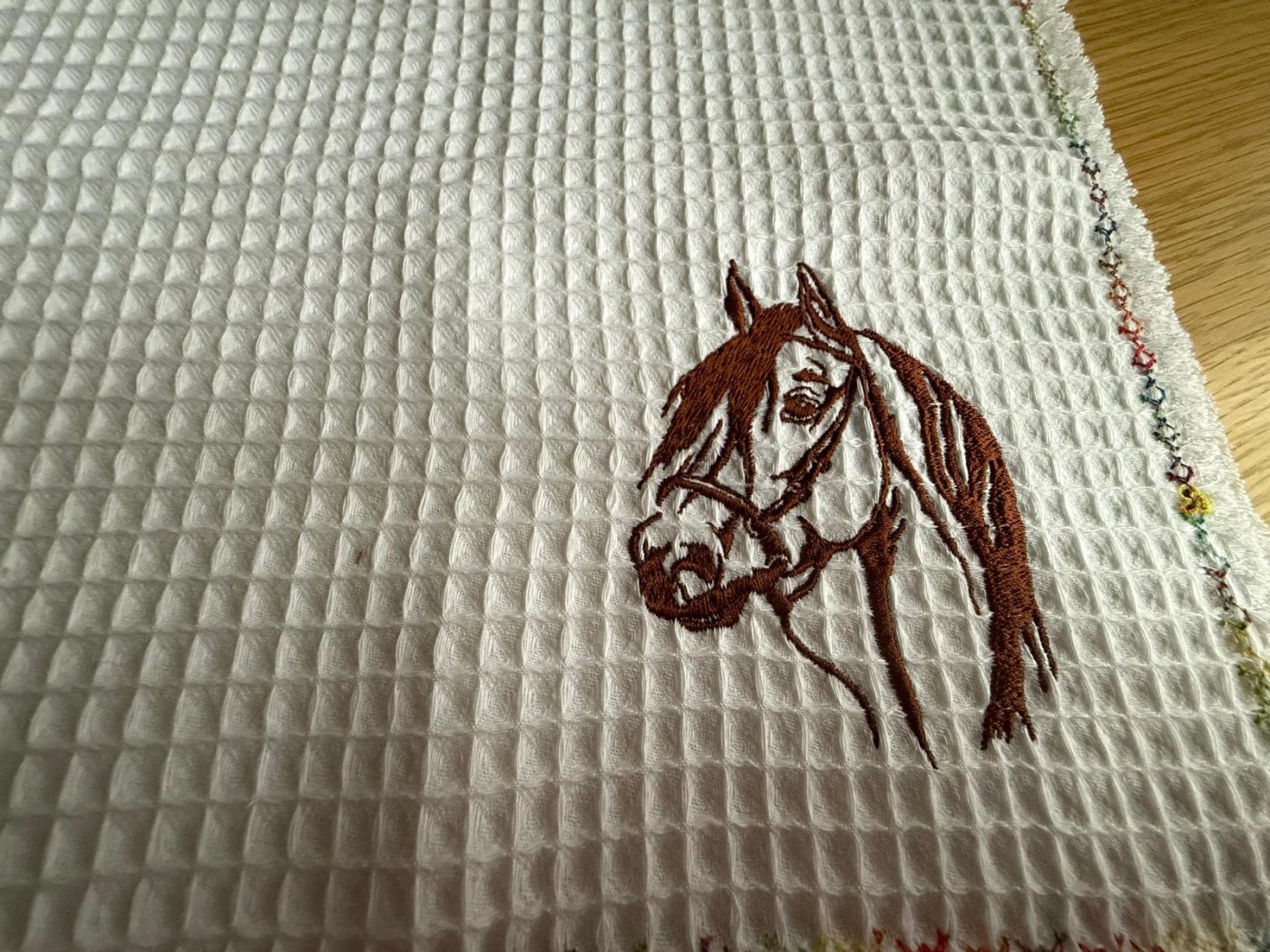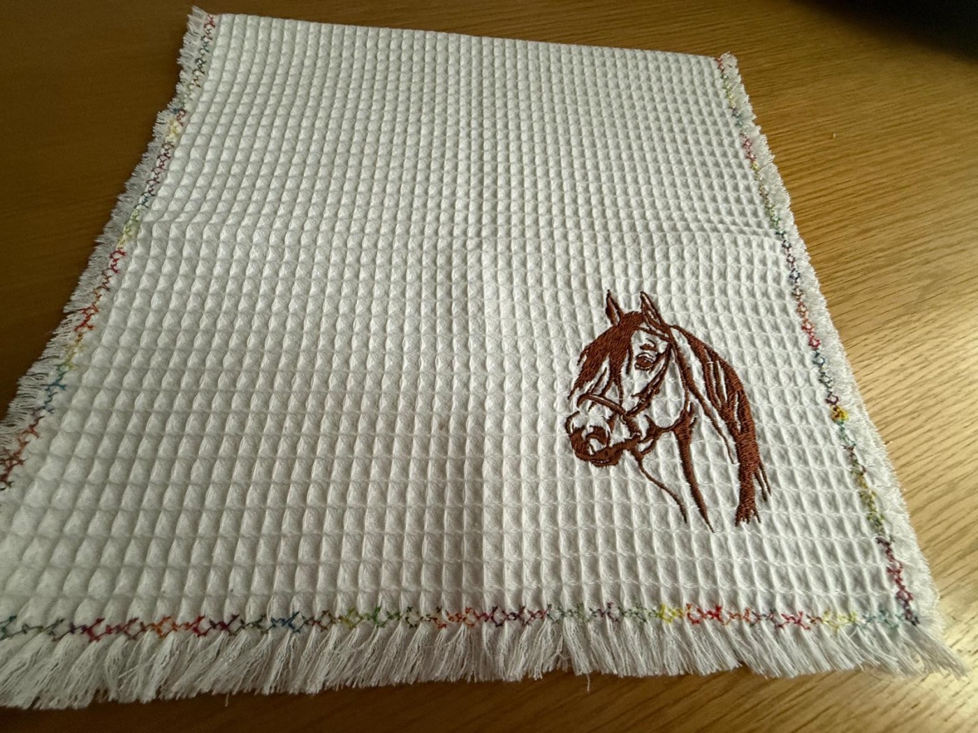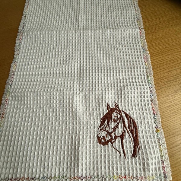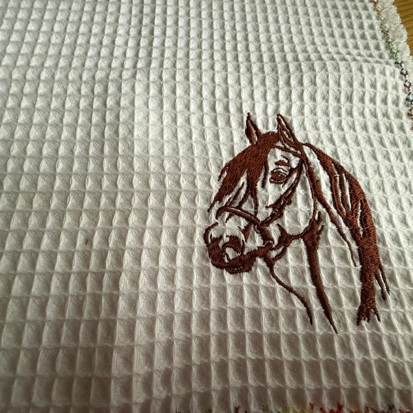 Balts kokvilnas vafeles šūts dvielis baltā krāsā, ar bārkstīm izmērs 30x 60CM . Virsū izšuvums 10X8 cm -zirgs