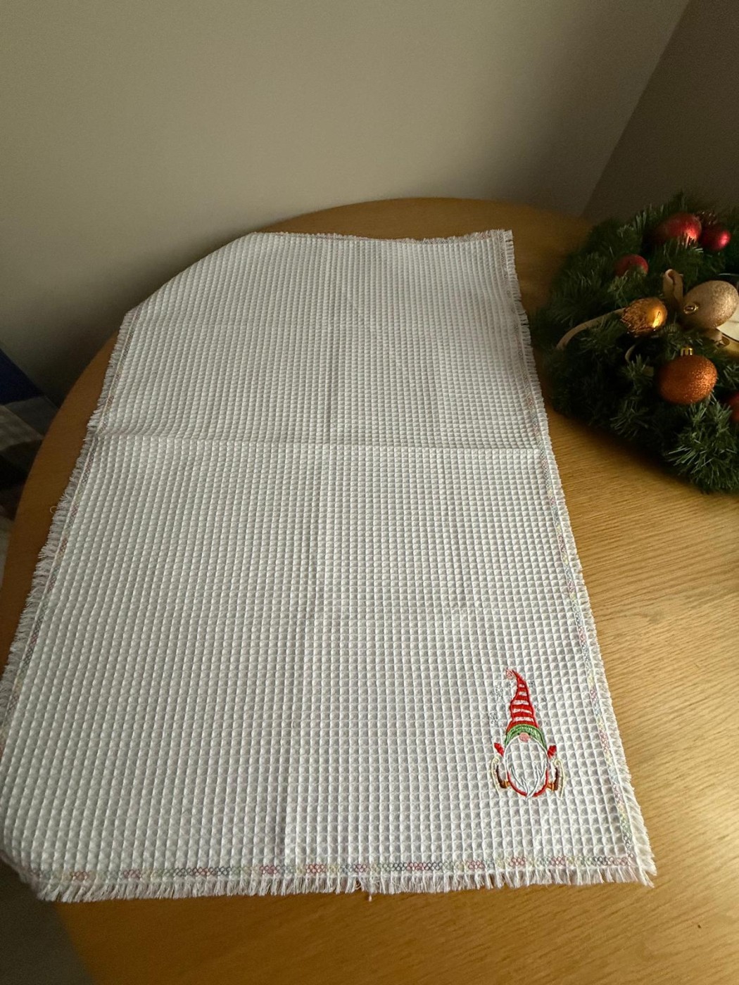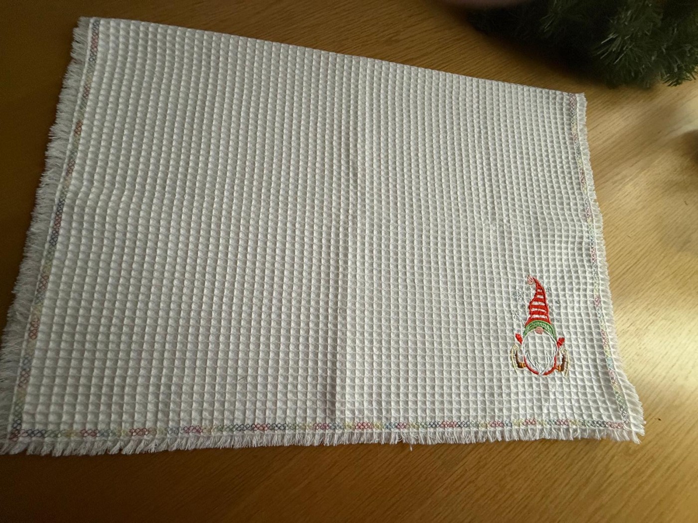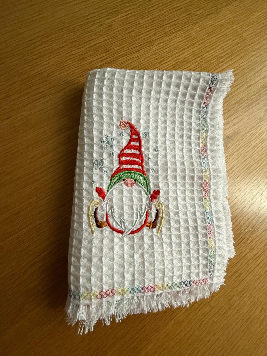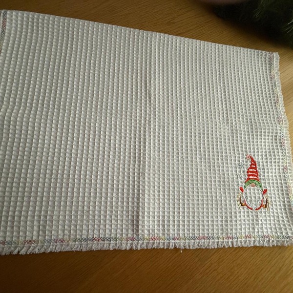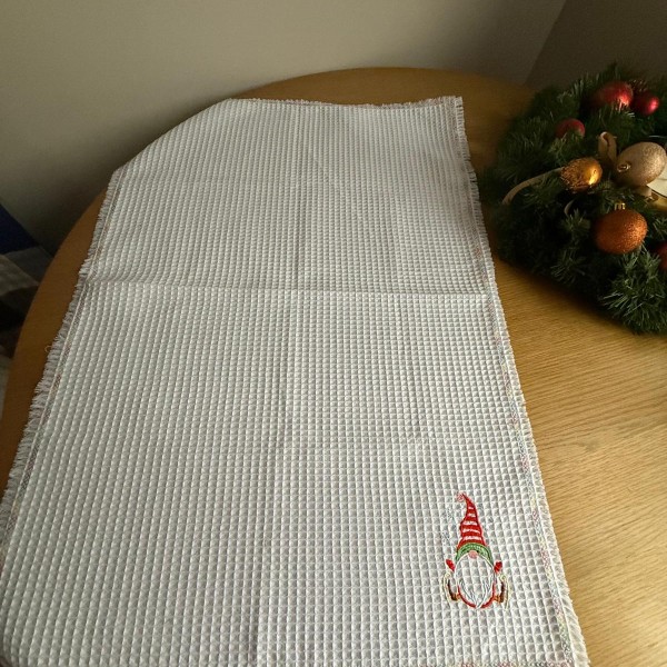 Balts kokvilnas vafeles šūts dvielis baltā krāsā, ar bārkstīm - izmērs 51x 73cm . Virsū izšuvums 10X6 cm -rūķītis.