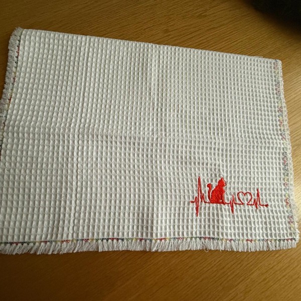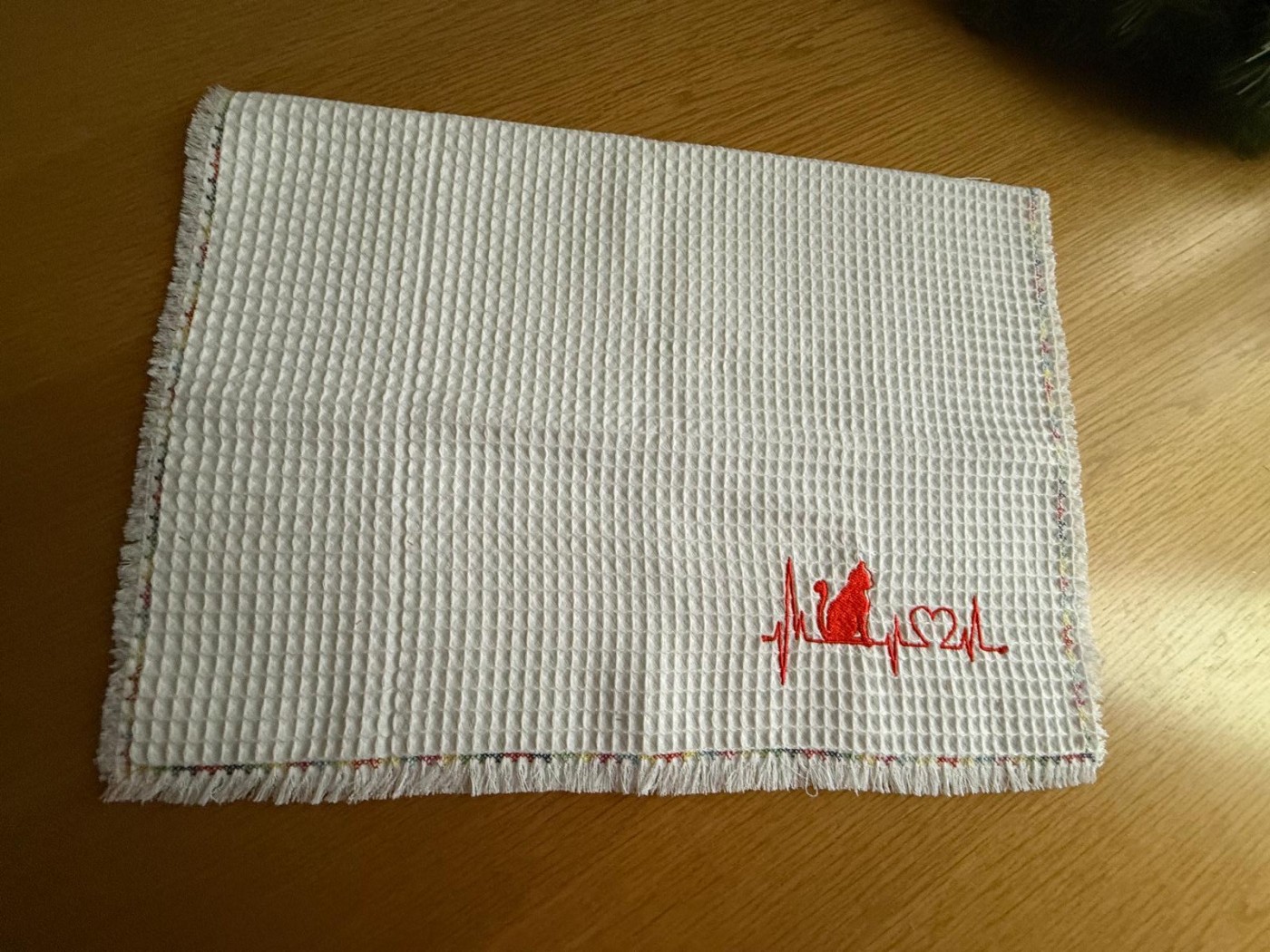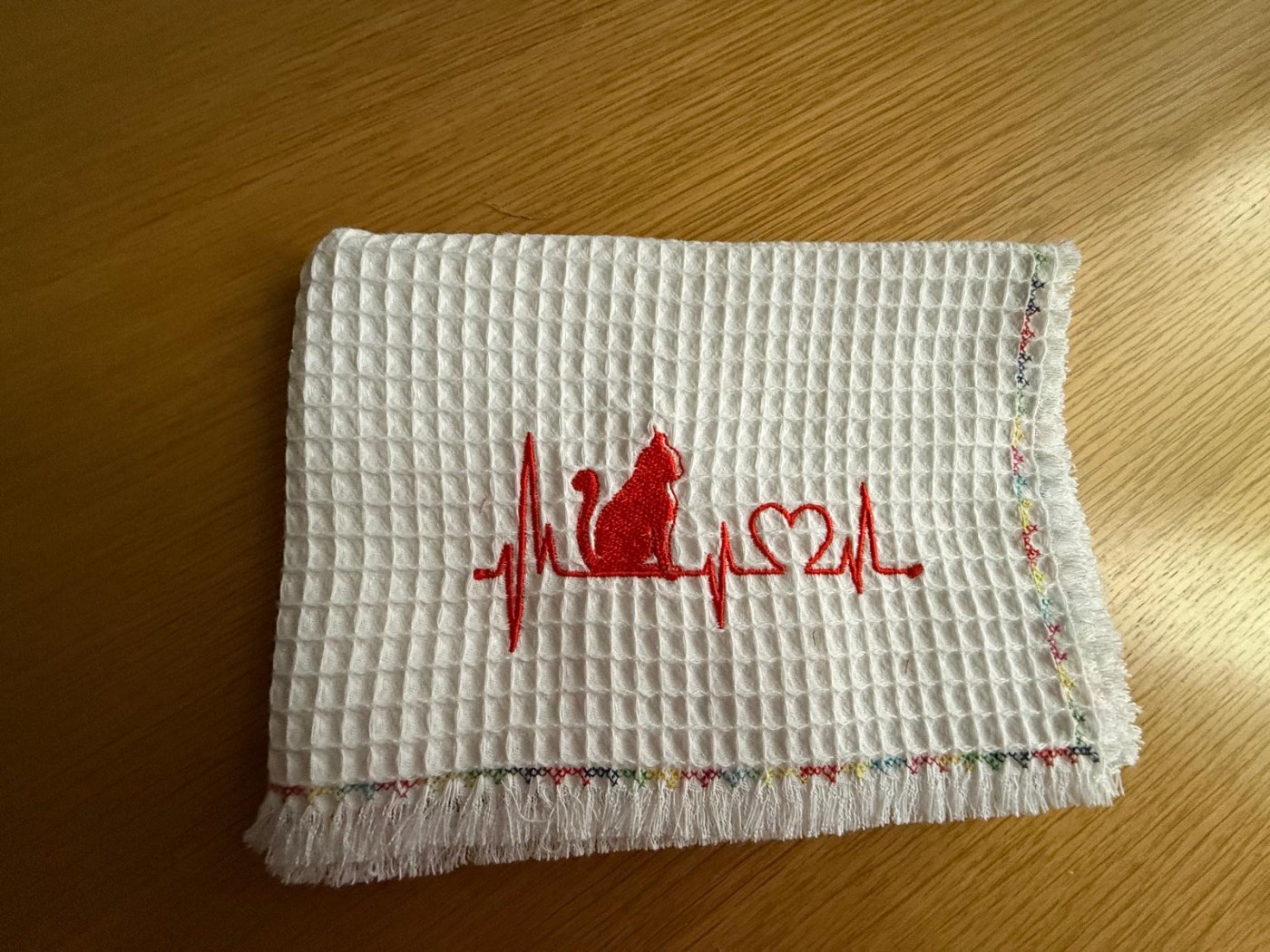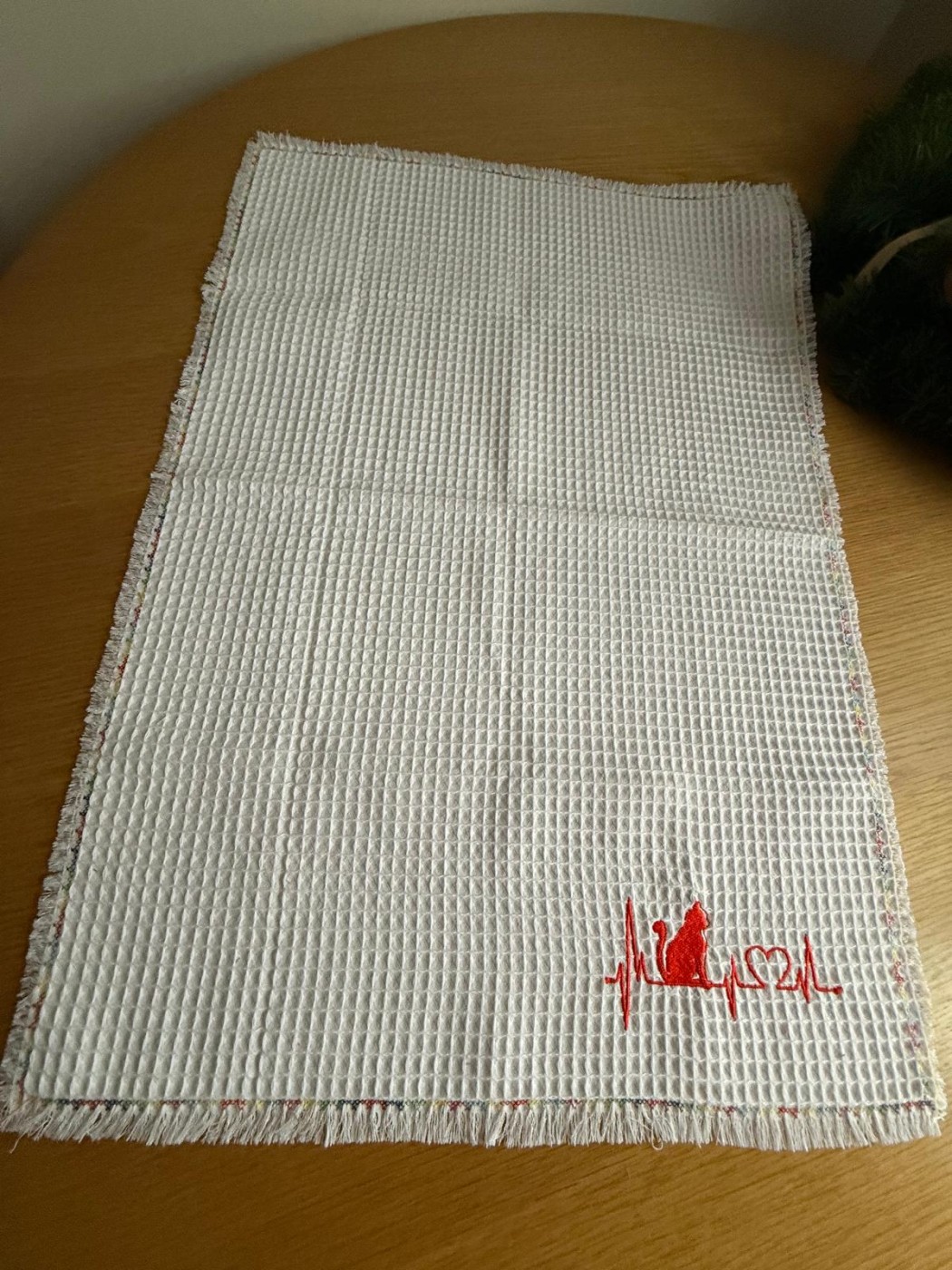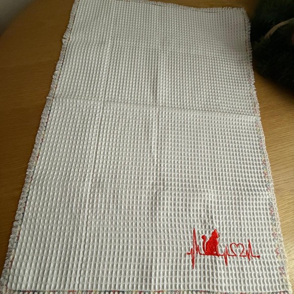 Balts kokvilnas vafeles šūts dvielis baltā krāsā, ar bārkstīm izmērs 42 x 60CM . Virsū izšuvums 12X6 cm -kaķis