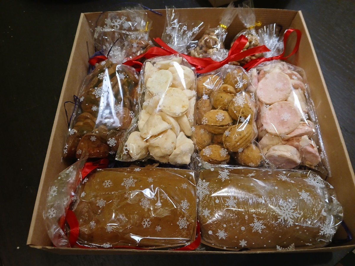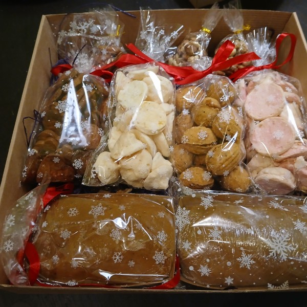 Ziemassvētku saldumu kaste.Kastē piparkūkas, saldie riekstiņi 350 g, bezē cepumi ar riekstiem,bezē cepumi aveņu, riekstu maisījums, 2 veidu piparkūku mīkla (klasiskā un ar apelsīnu sukādēm kopā 700 g), smilšu mīklas ananāsu cepumiņi.Rezervēju pasūtījumus uz decembri!Kasti var dalīt vairākās mazās dāvanās.