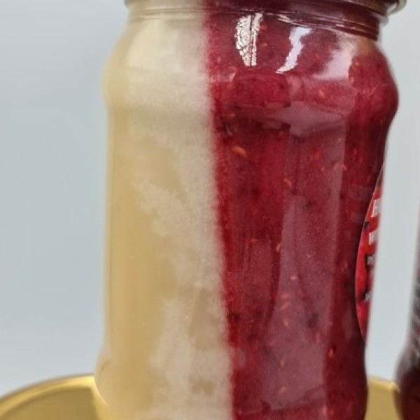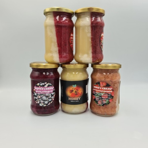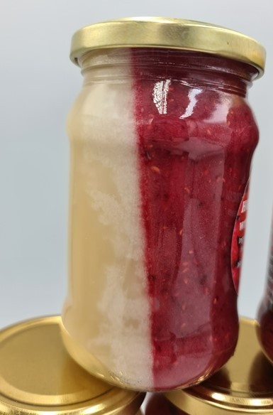 🍯 Vienā burciņā – dabīgs medus vienā pusē, saldo krēmmedu ar sublimētām ogām otrā pusē.