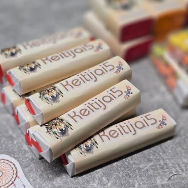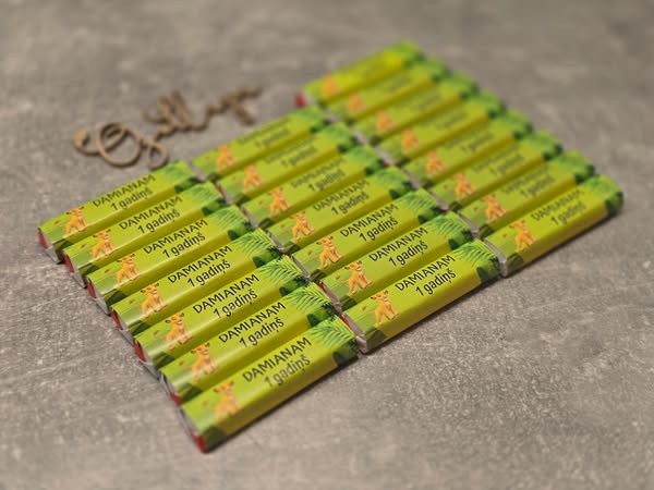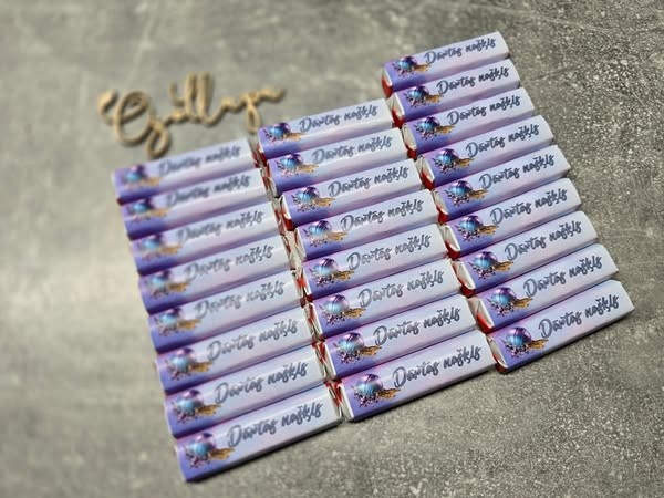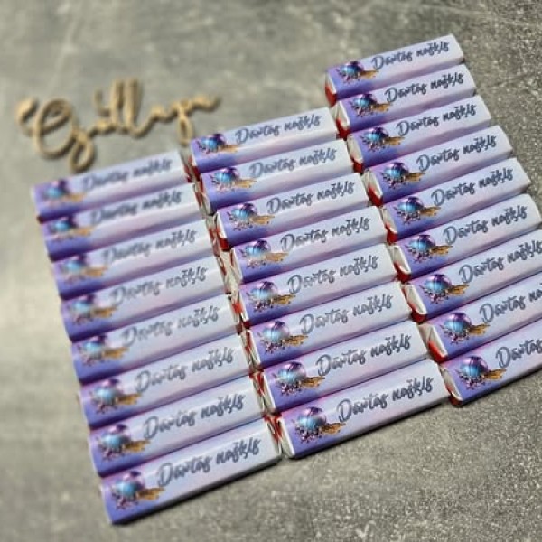 Dizaina papīrītis tiek likts pāris oriģinālajam šokolādes papīrītim, kas ir sarkanbaltā krāsā. Šokolādes izmērs: ~1,5 * 7,2cm