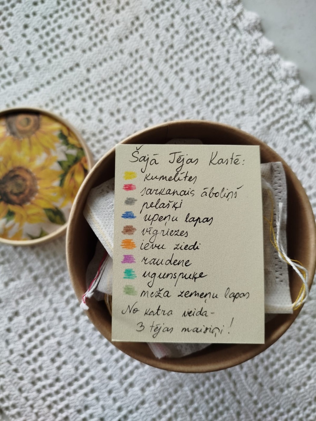 Kastītē ir 9 dažādas lauku tējas, no katra tējas veida - 3 tējas maisiņi (ar krāsainām aukliņām, lai vieglāk atrast meklēto).