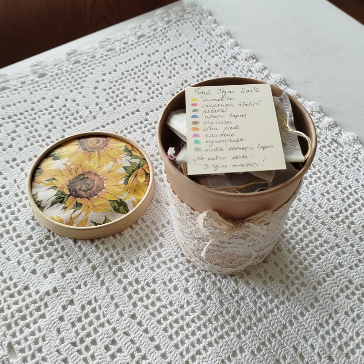 Apaļā tējas kastīte ar mežģīni un dekupētu vāciņu. Smalks, rūpīgs un detalizēts roku darbs.