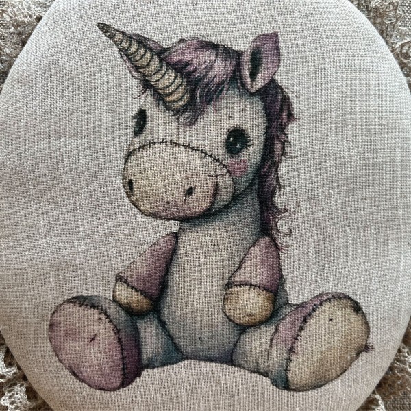 Vāki: lins, ar rokām zīmēta ilustrācija "Junikornu meitenīte" uzdrukāts uz lina auduma, stepēts ovāls ar lina mežģīnīti.