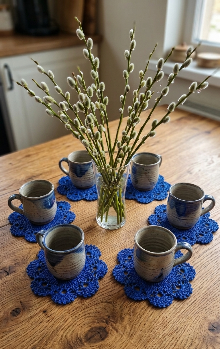 Var izmantot zem krūzītēm, lai pasargātu galda virsmu no karstuma un skrāpējumiem, var arī zem puķu podiem, arī labi izskatīsies.