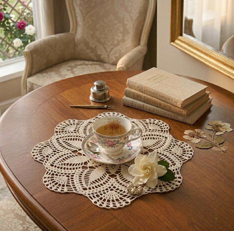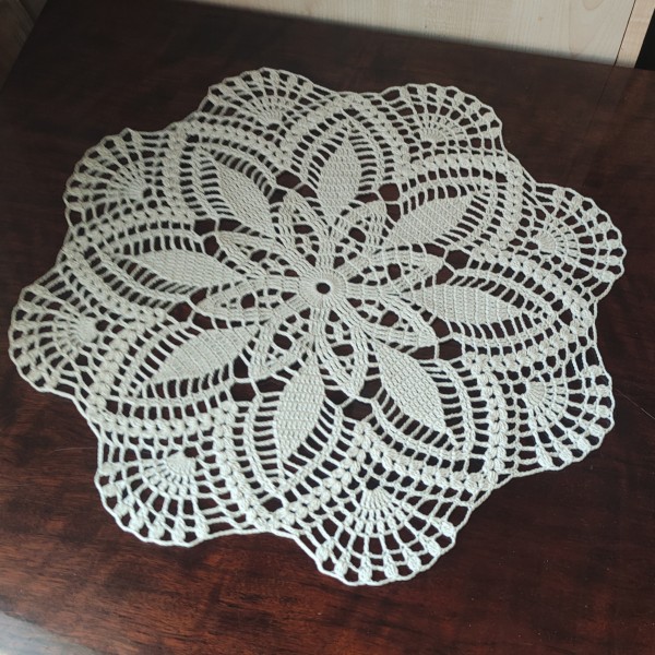 Tamborēta galda sedziņa, ir pieejama uzreiz. Diametrs 44 cm. Krāsa ekru (ziloņkaula).