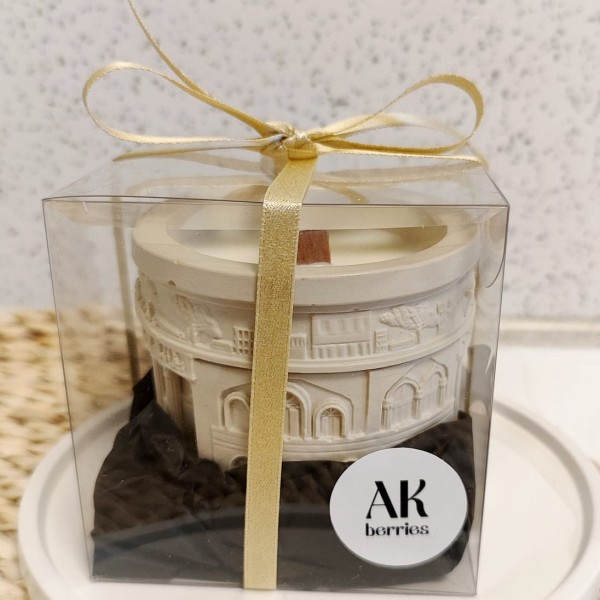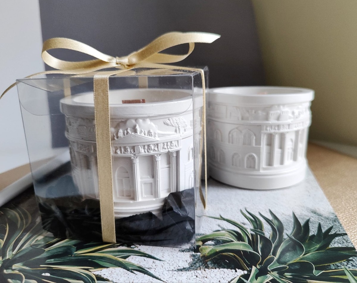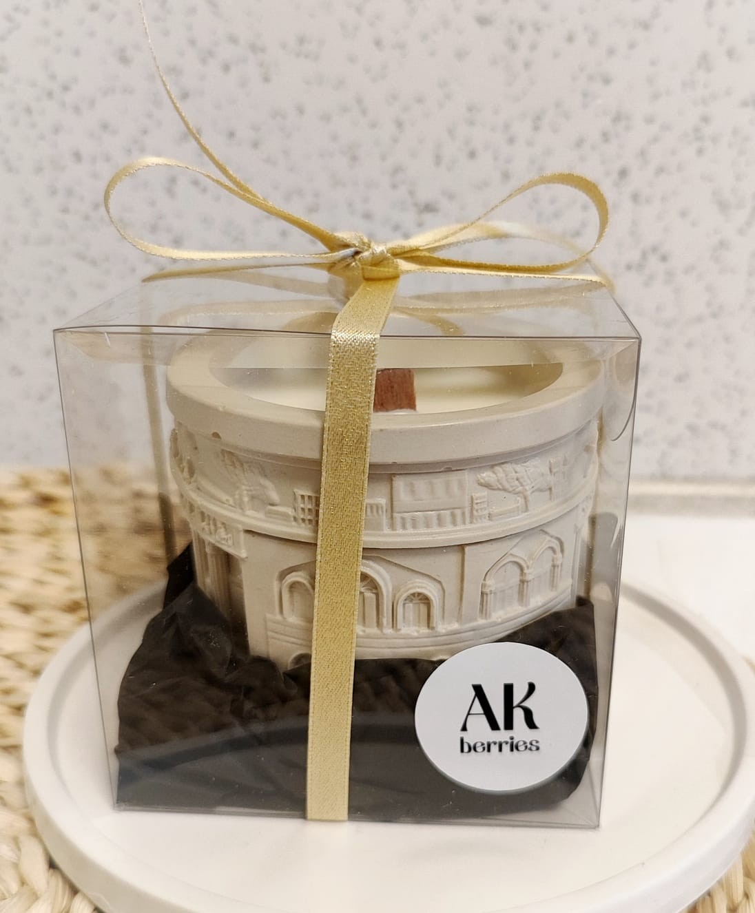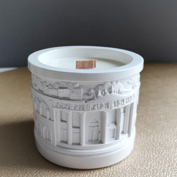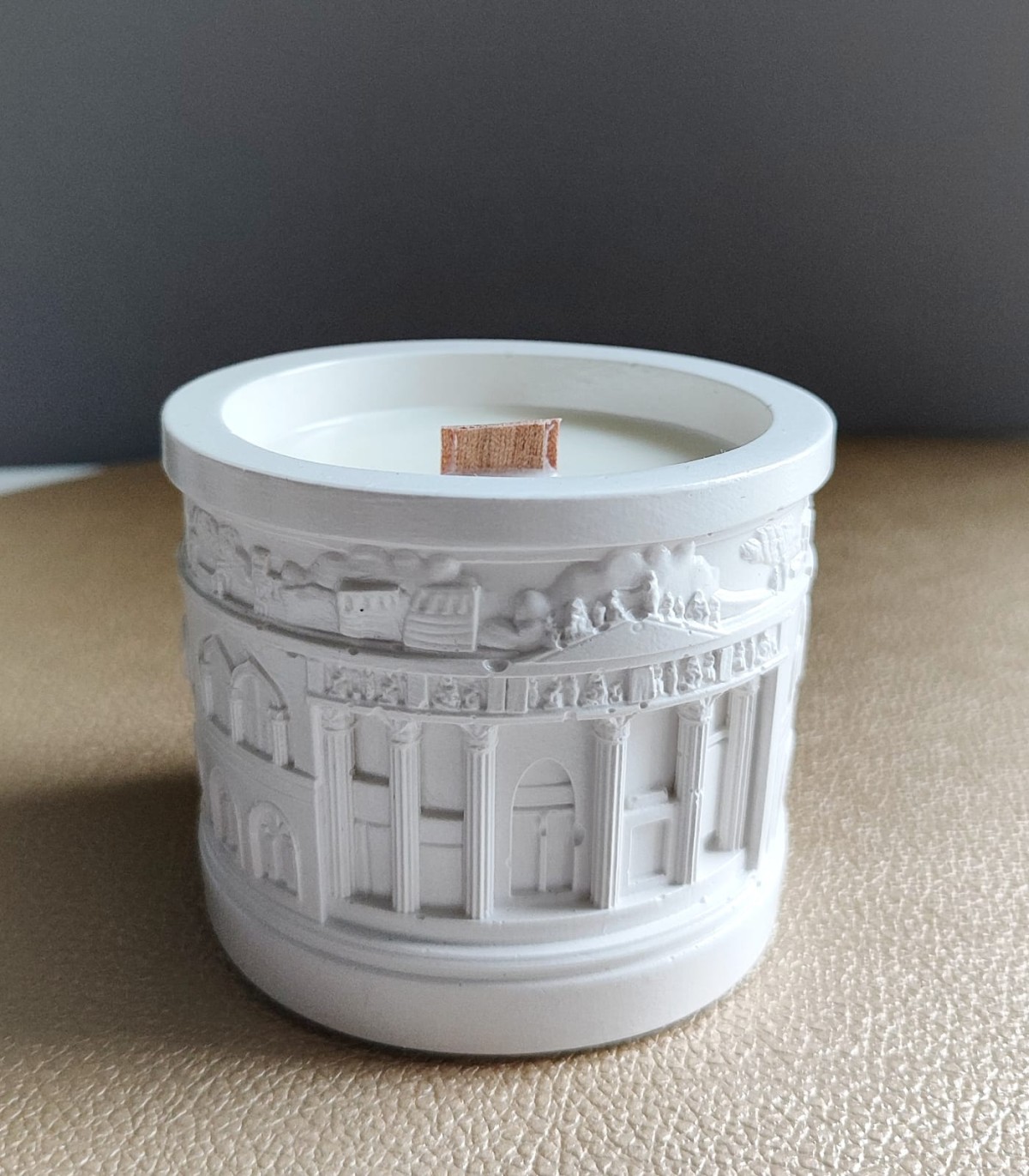 Roku darbs - svece veidota ģipša traukā ar Grieķijas arhitektūrai raksturīgām līnijām, piepildīta ar dabīgu sojas vasku un koka dakti.
