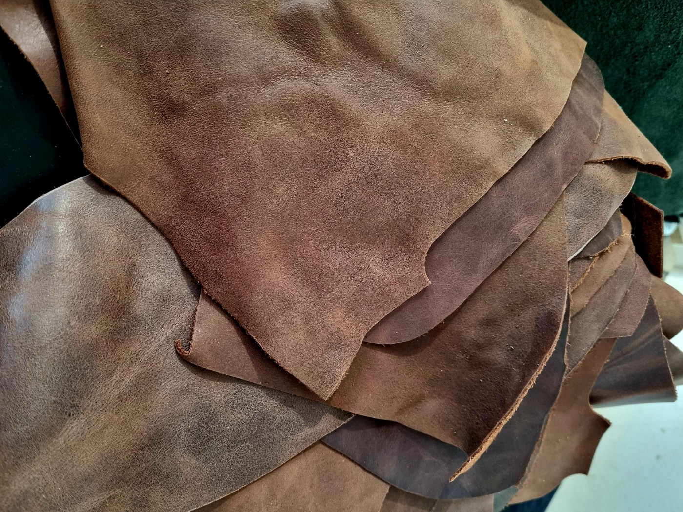 Brūni crazy horse ādas atgriezumi uz svara - sasaiņoti pa 2 kg pakām