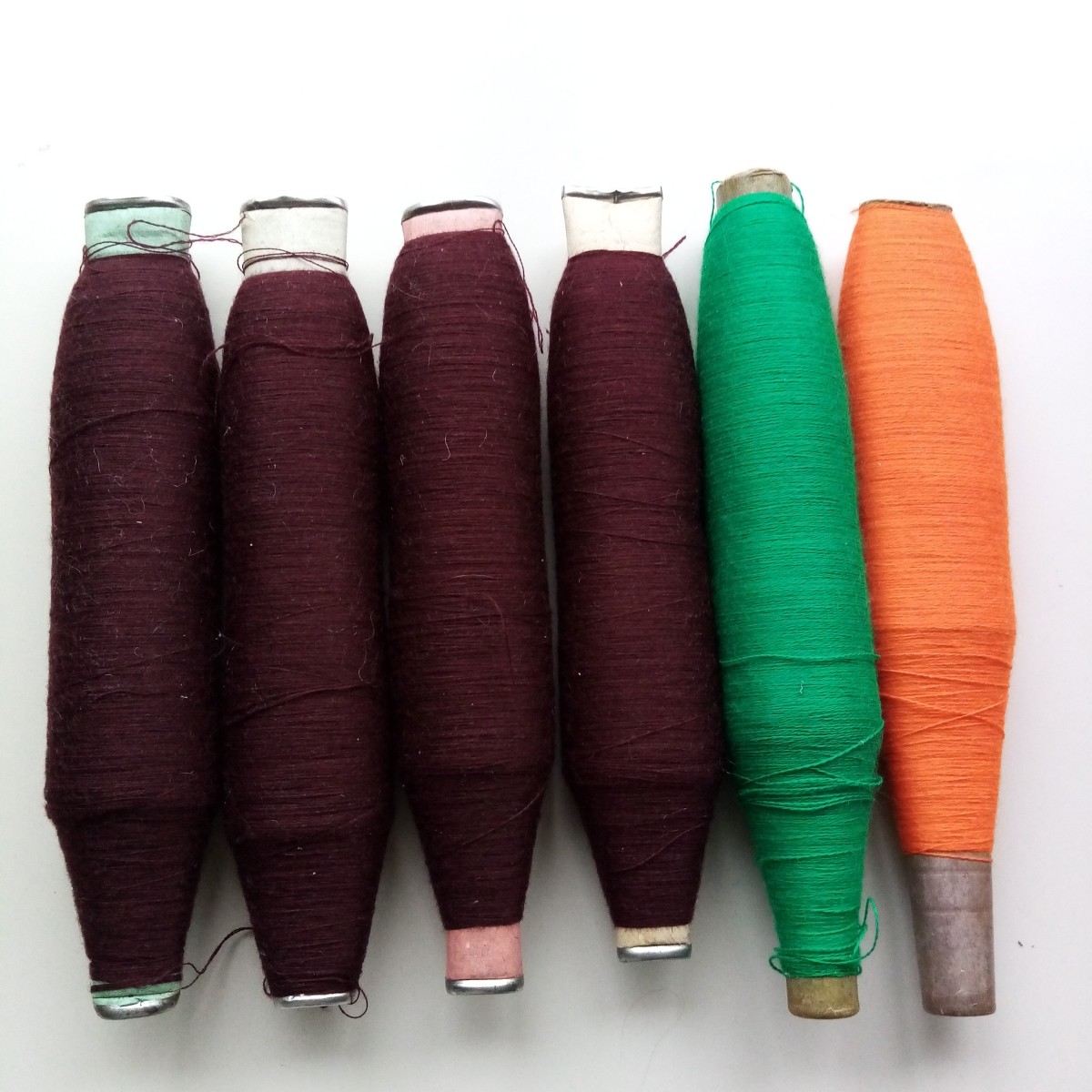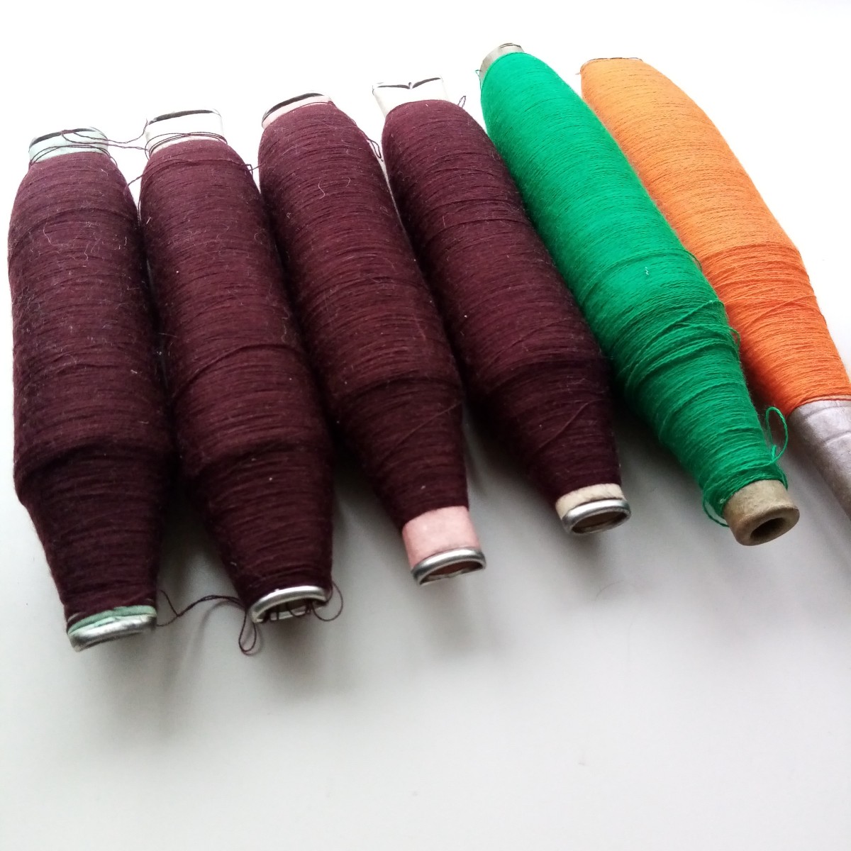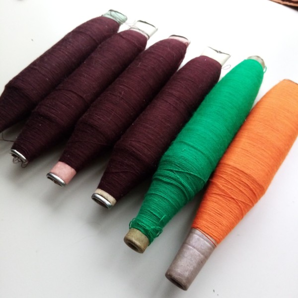 Smalku vienkārtas pusvilnas / vilnas diegu spoles palikušas pēc lakatu aušanas. Svars kopā ar spolēm 800 gr.