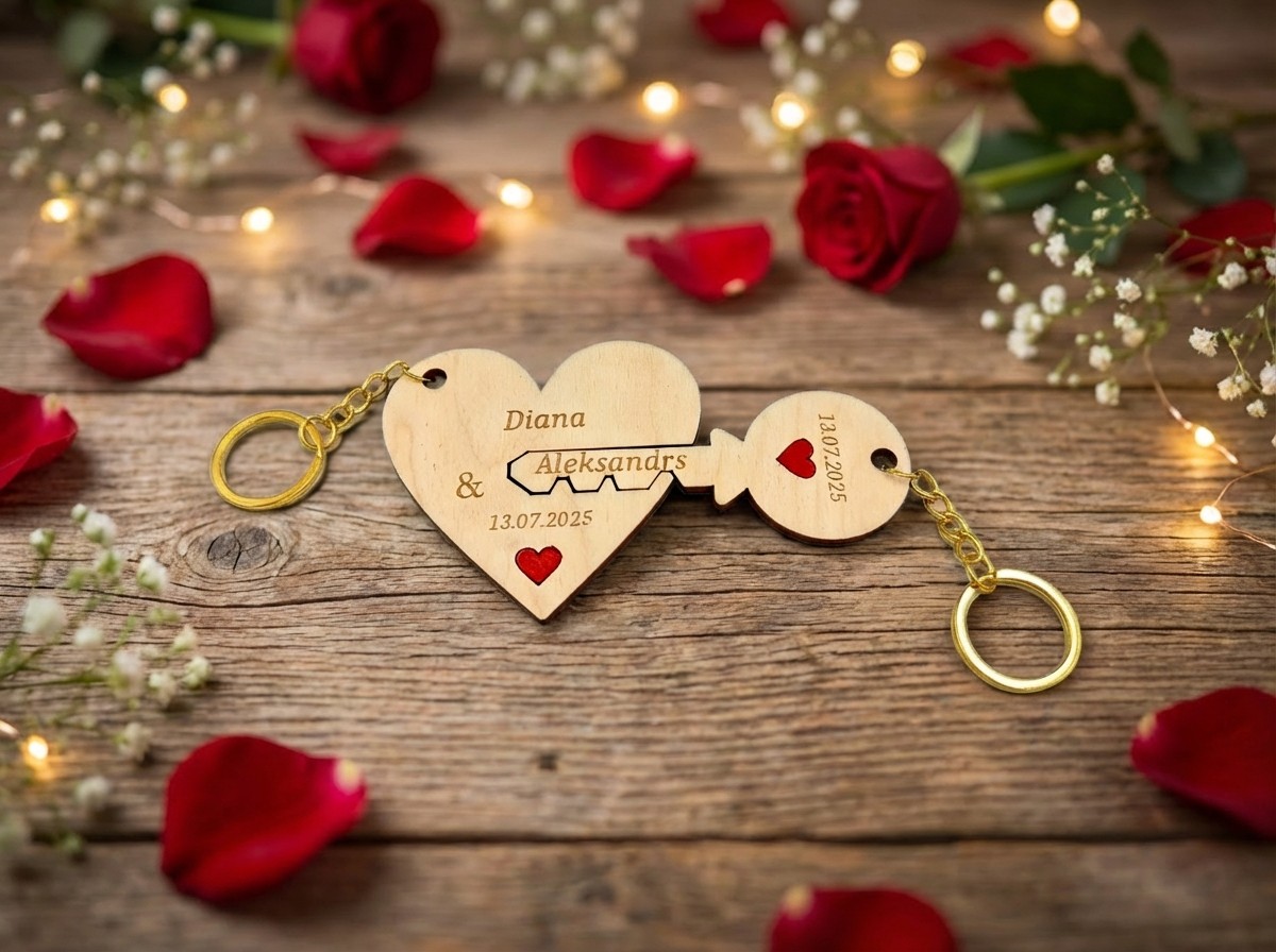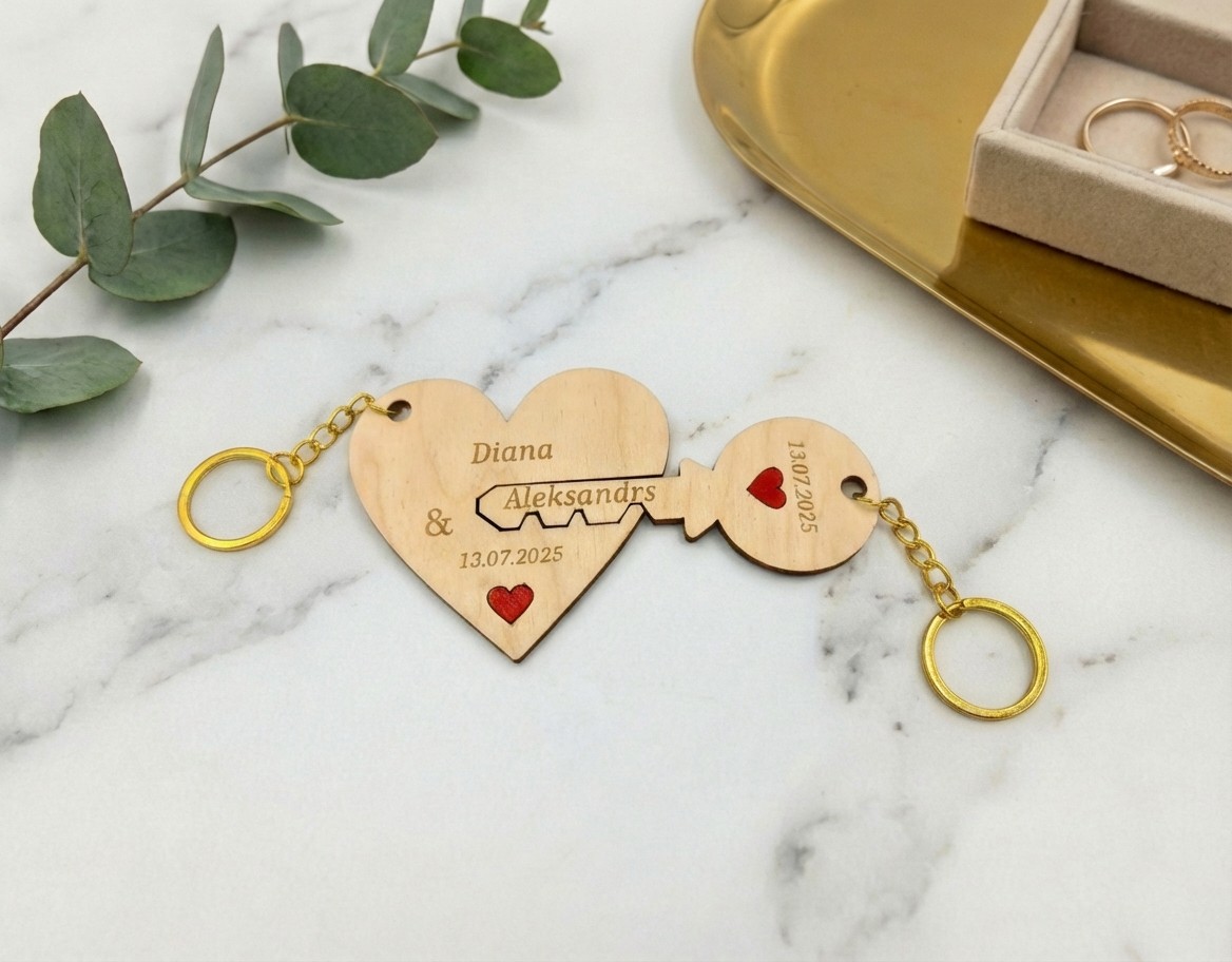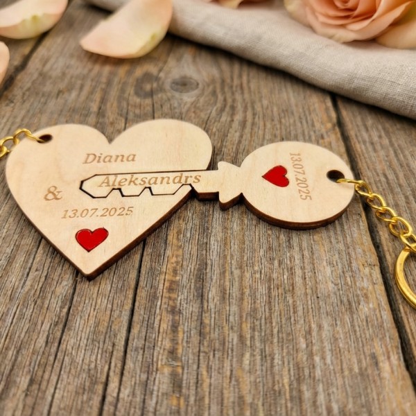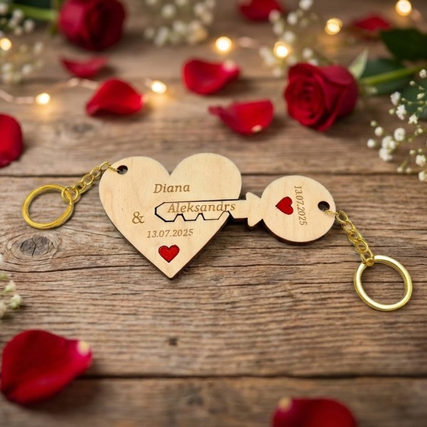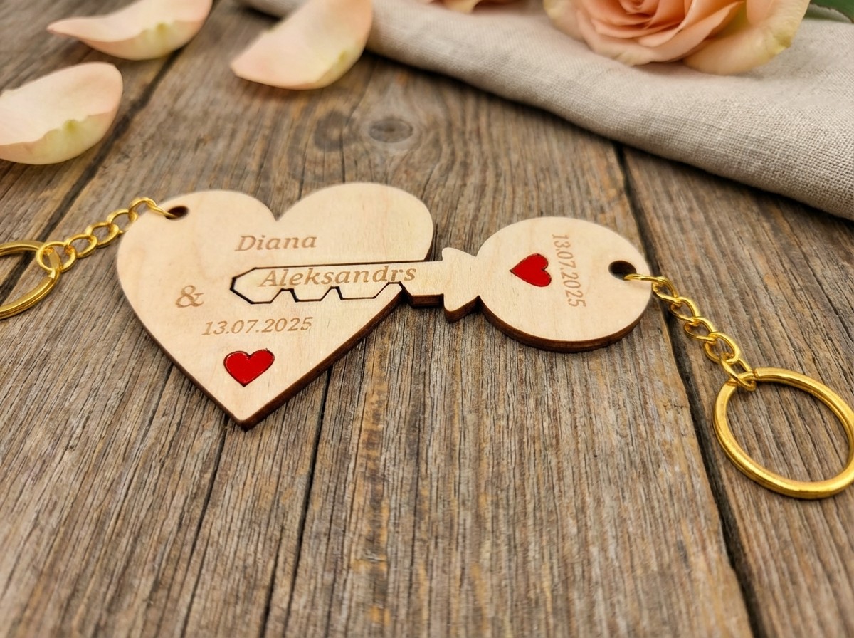 Sirsnīgi roku darba koka atslēgu piekariņi, kas simbolizē saikni, mīlestību un īpašus mirkļus. Ideāli kā dāvana pāriem, kāzām, jubilejām vai vienkārši mīļam pārsteigumam.
