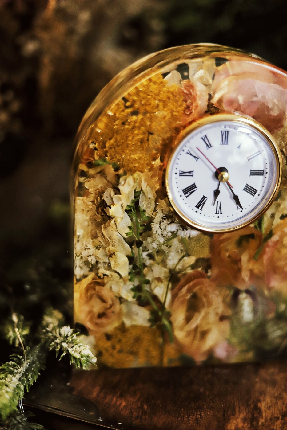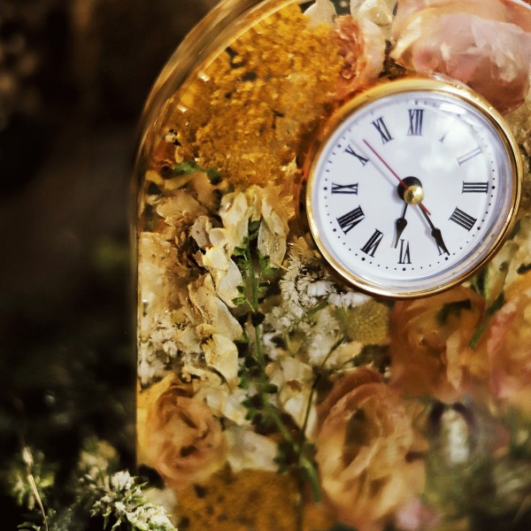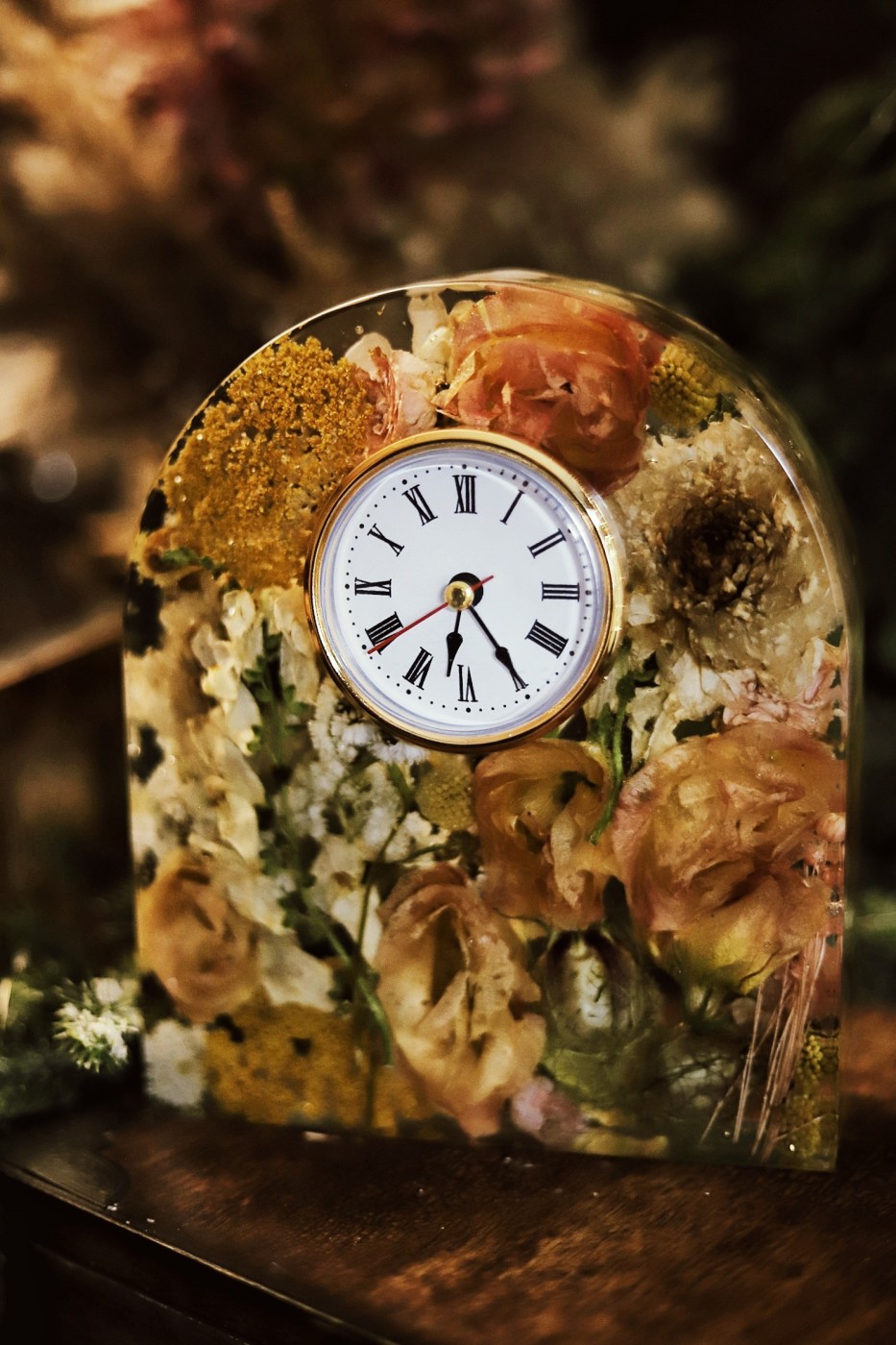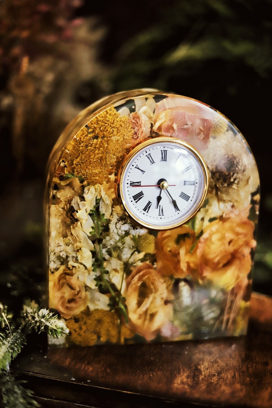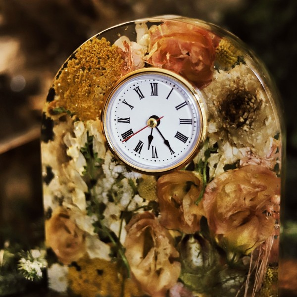 Pulksteņa dekors no epoksīdsveķiem. Veidots izmantojot līgavas iesūtītos kāzu ziedus.