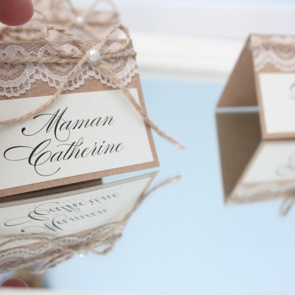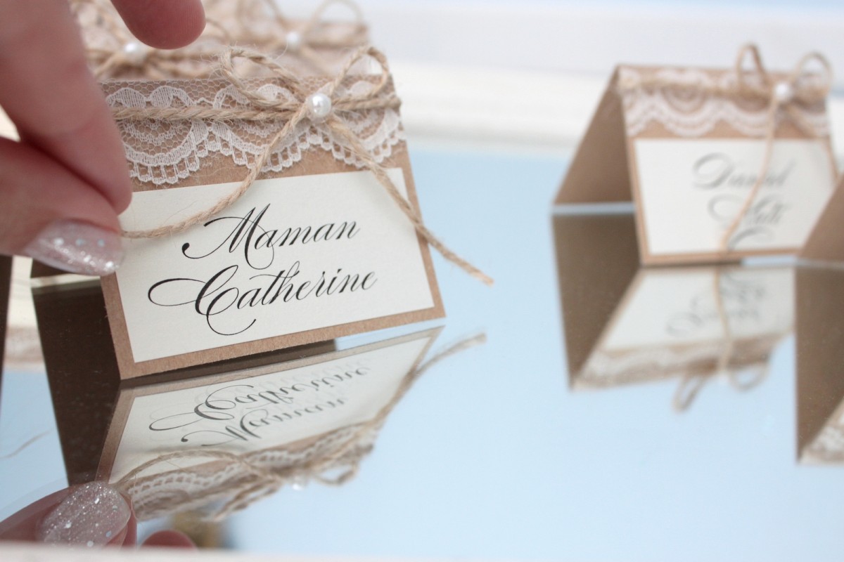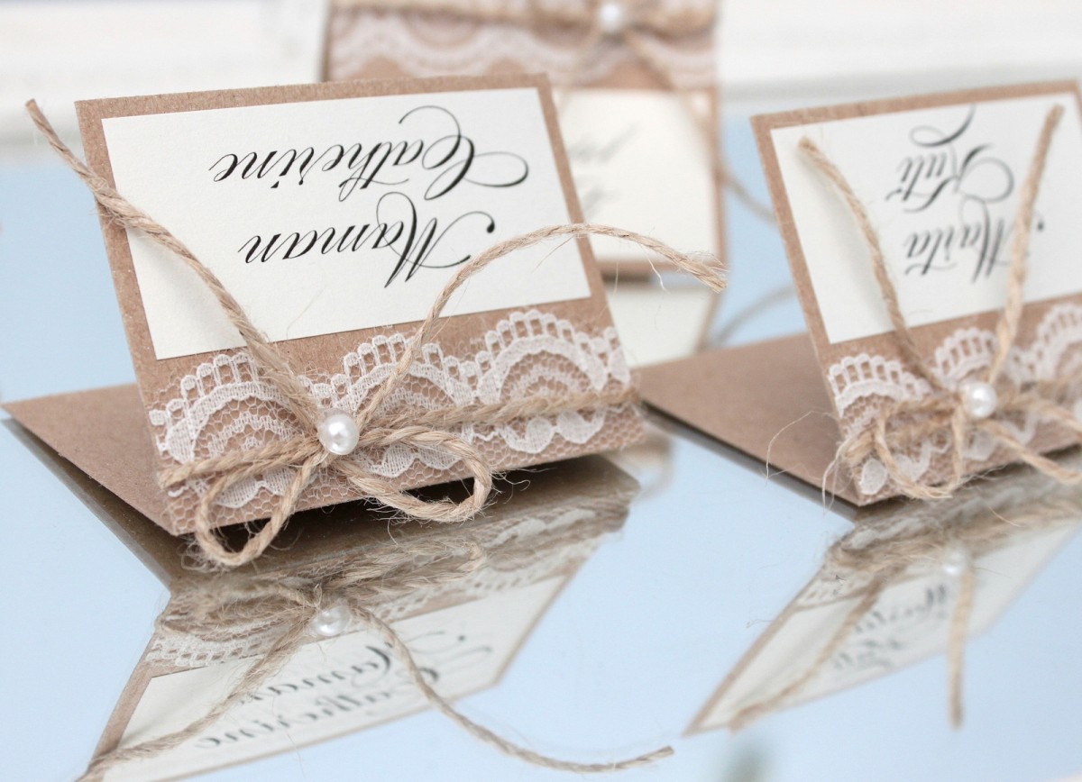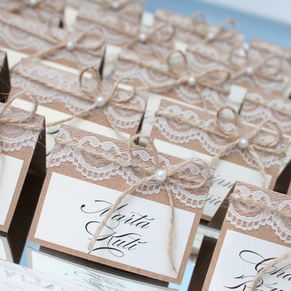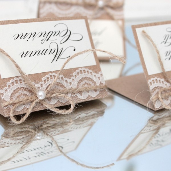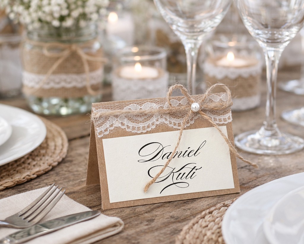 Rustiska stila galda kartītes no kraftpapīra ar viesu vārdiem. Kartītes rotātas ar smalku mežģīni, dabīgu aukliņu un nelielu pērļu akcentu, kas piešķir siltu, romantisku un mājīgu noskaņu. Dabiskie materiāli un pārdomātās detaļas lieliski papildina lauku, vintage vai boho stila galda noformējumu, radot harmonisku un viesmīlīgu koptēlu īpašam notikumam.