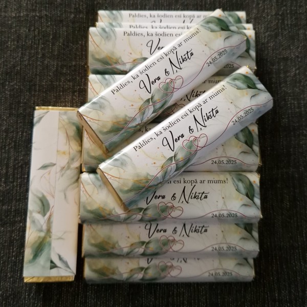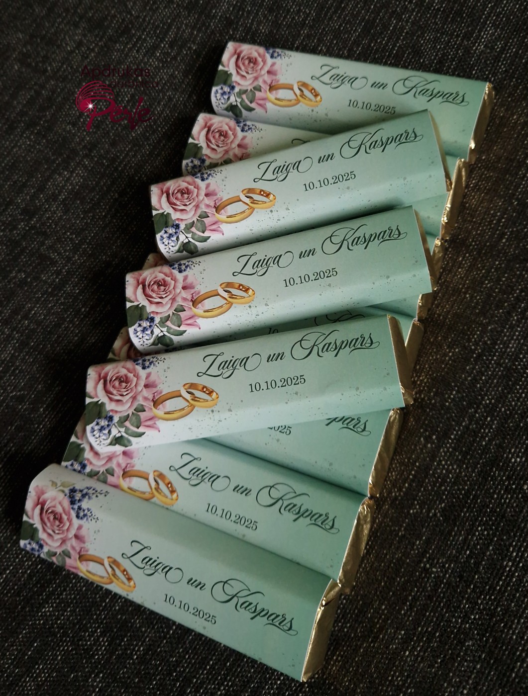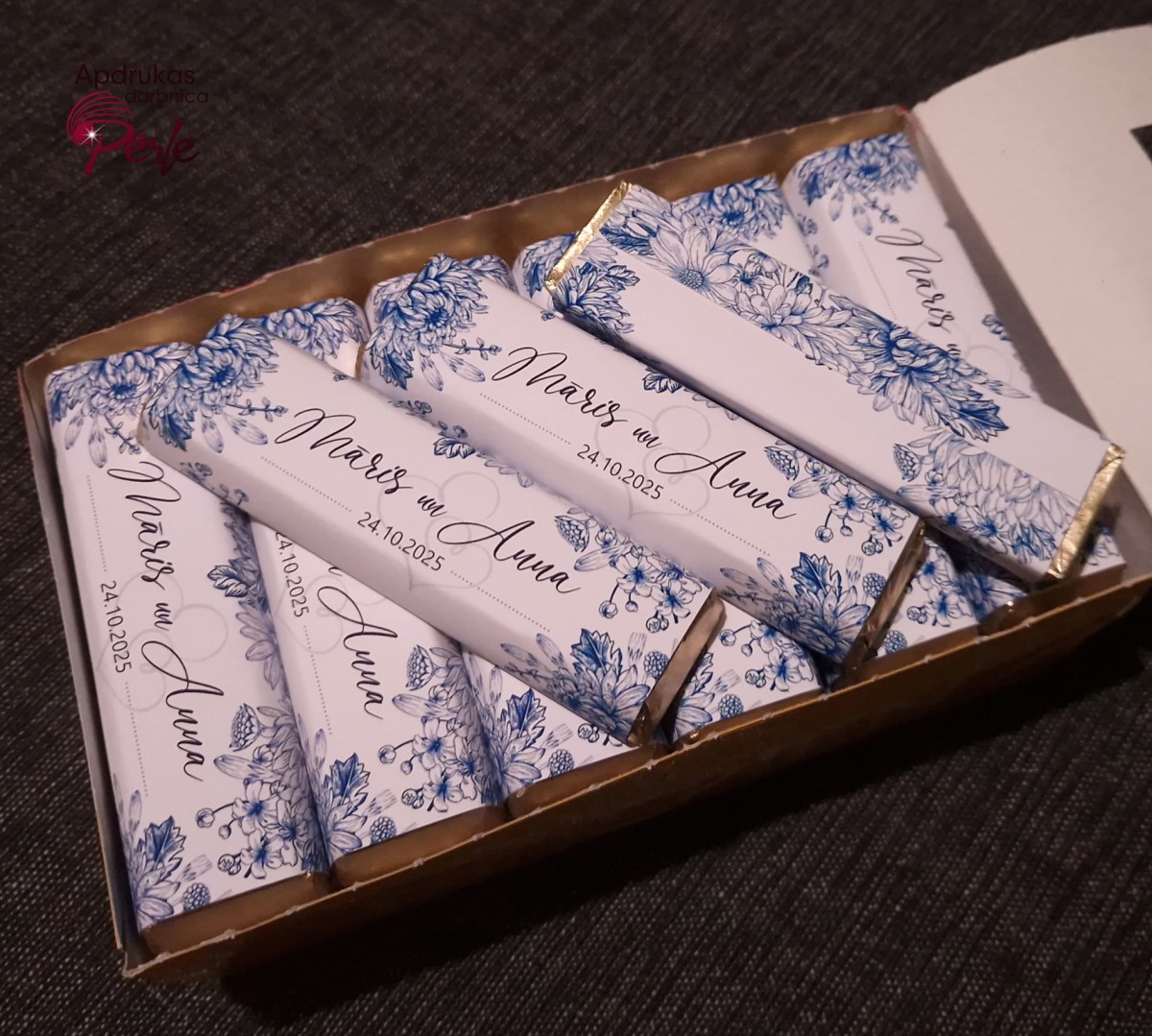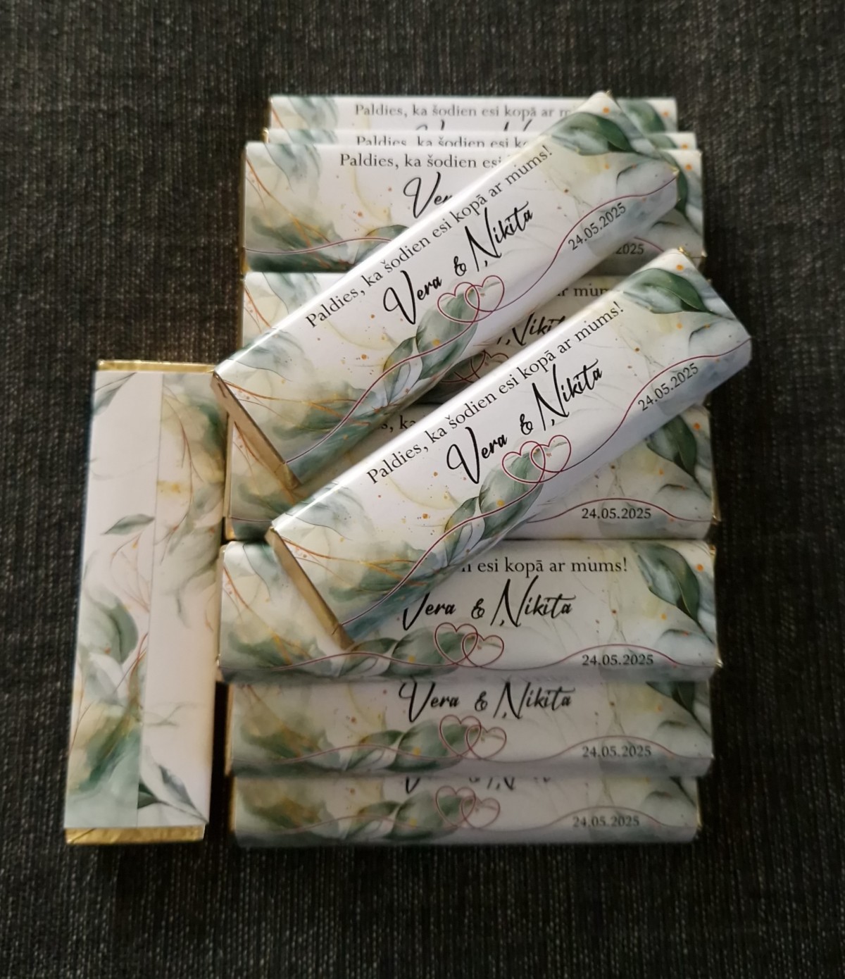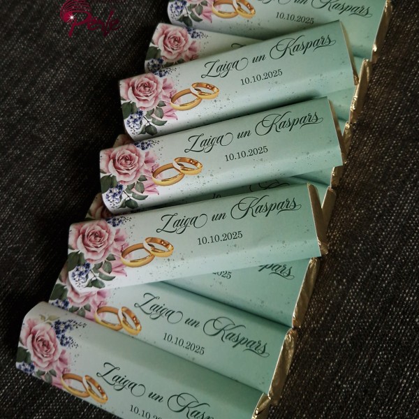 Dizains tiek sagatavots katram klientam individuāli pēc vēlmēm. Cenā šokolāde + etiķete, aplīmēšana. Attēlā redzamas "Roshen" 43g šokolādes. Daudzumiem zem 10gb var tikt piemērotas maketa sagatavošanas izmaksas.