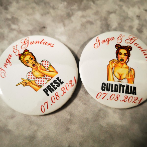 Kāzu programmas neatņemama sastāvdaļa ir amatu dalīšanas pasākums. Šim nolūkam piedāvājam vairākus risinājumus- klasiskāka, elegantāka stila vai arī karikatūriskas, amizantas amatu atpazīšanas zīmes. Metāla amatu nozīmītes, piespraužamas.