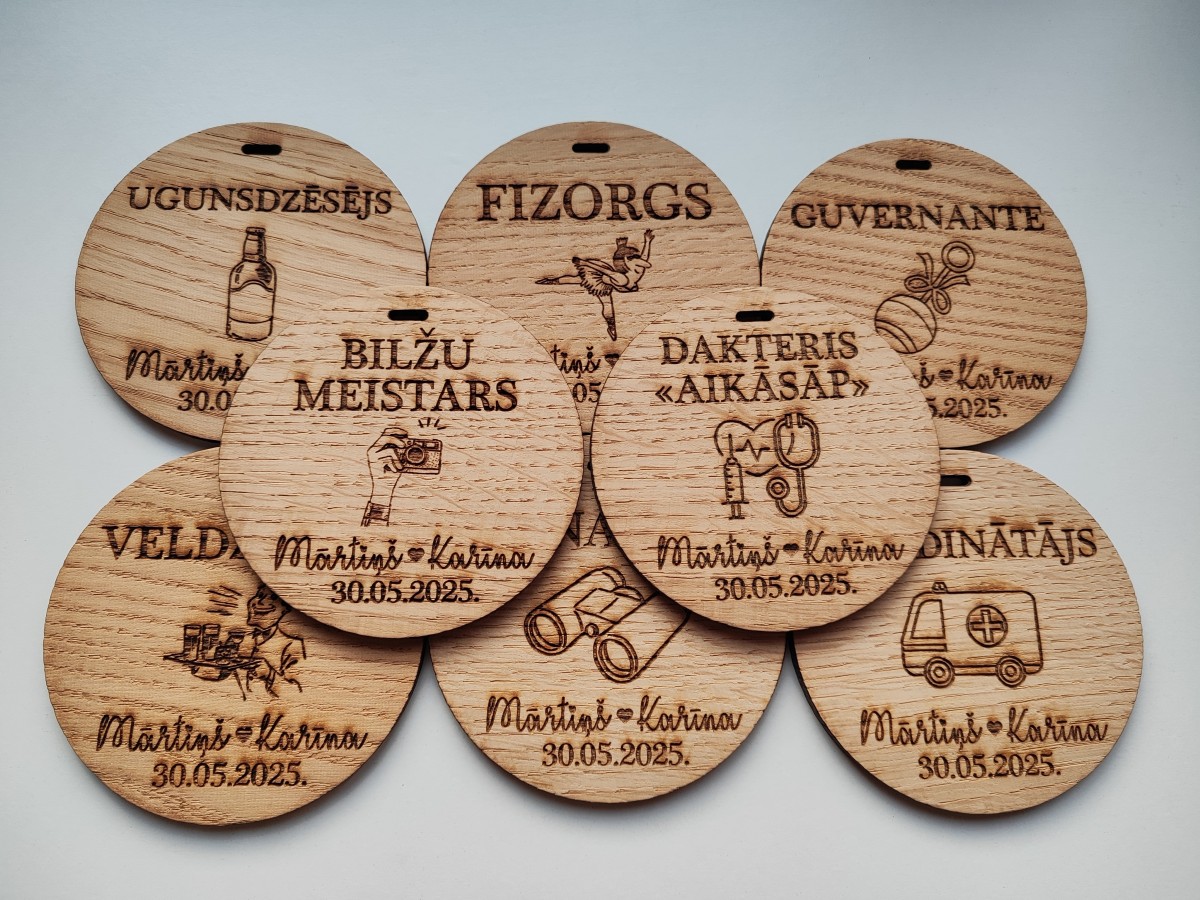 Veicot pasūtījumu nosūtu klientam vairāk kā 100 medaļu zīmējumus, no kurām izvēlēties sev tīkamākos un pašiem pieskaņot tieši jūsu izvēlētajiem amatiem. Ka arī var izvēlēties medaļām saskaņotu - vienādu noformējumu un/vai iniciāļus zīmējuma vietā. Medaļu izmērs - 9,5 cm.