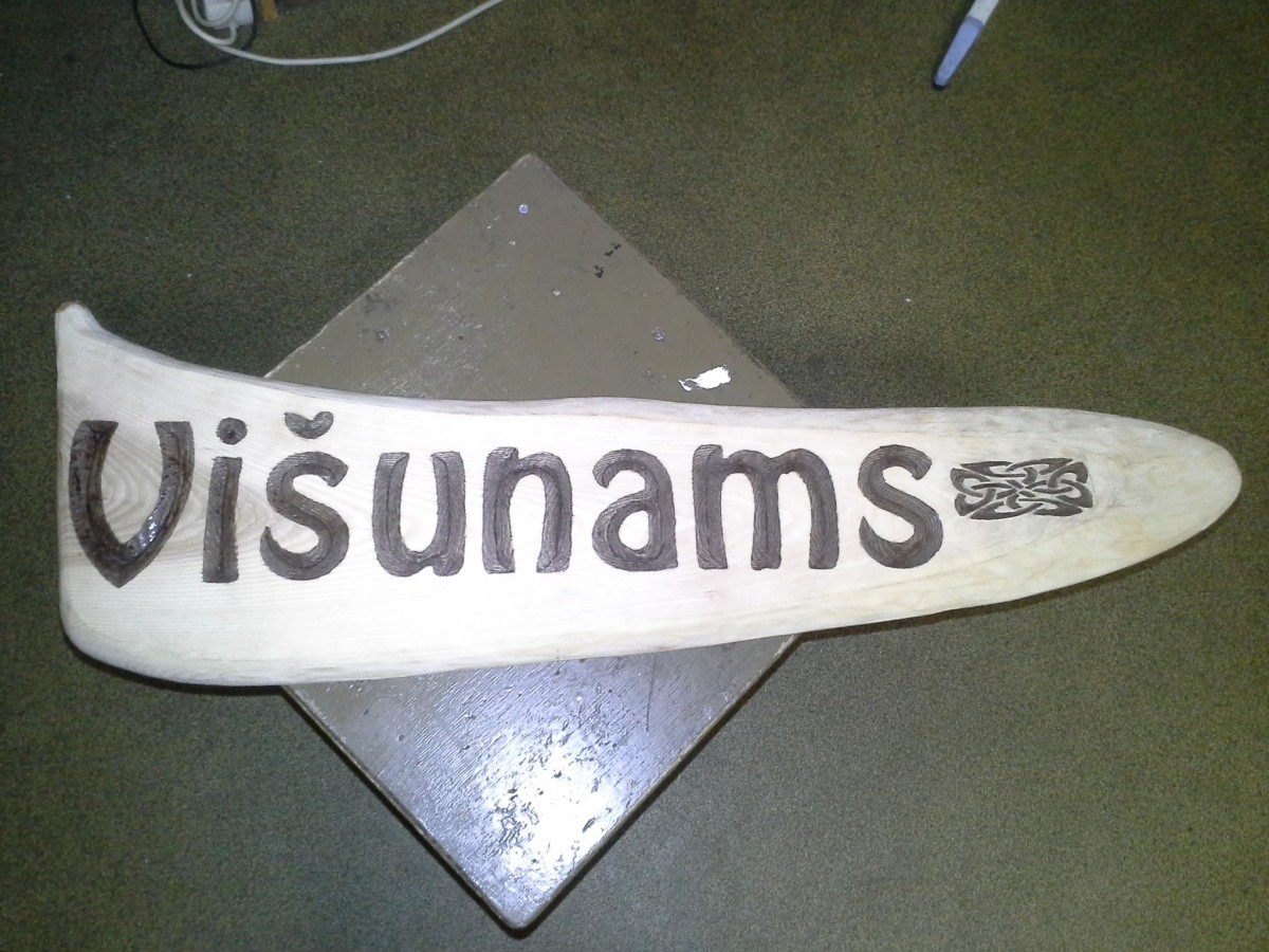 Uzraksts izveidots uz viengabala ozola dēļa, burti un zīmejums tonēti ar Pinotex, uzraksts lakots ar Tikkurila kuģu koka detaļu laku.
