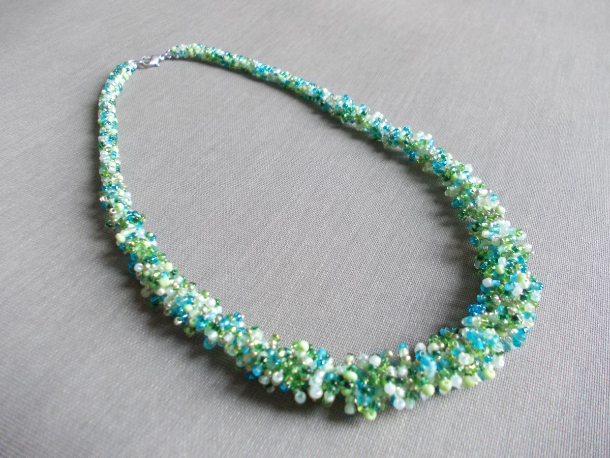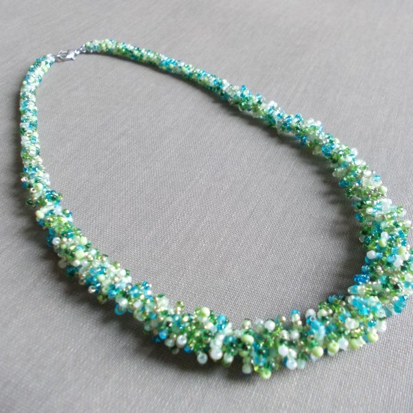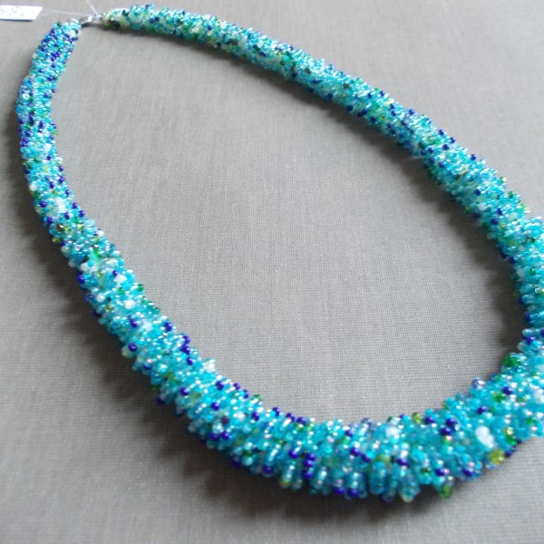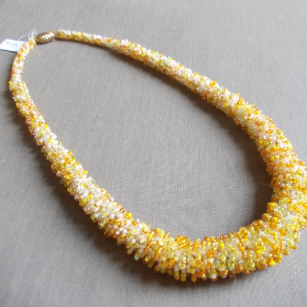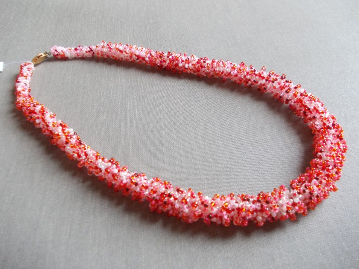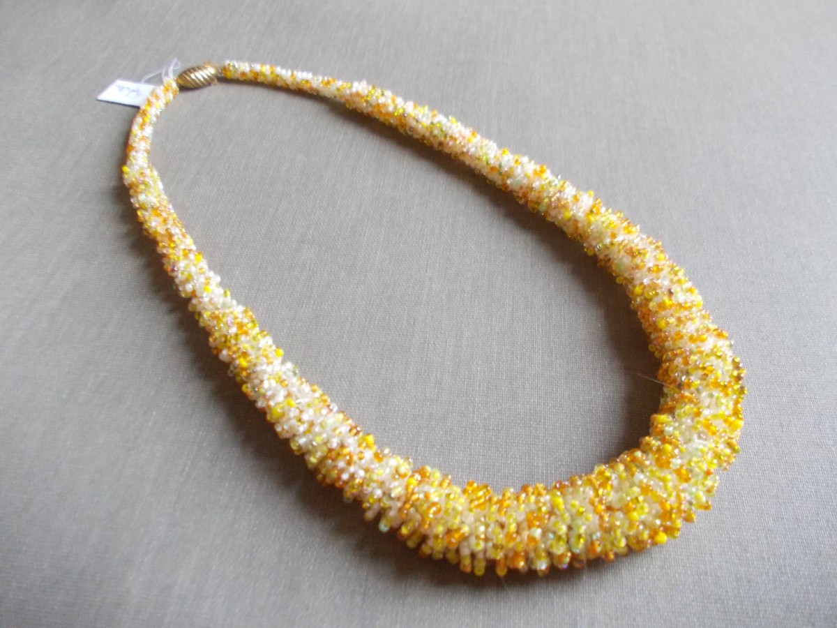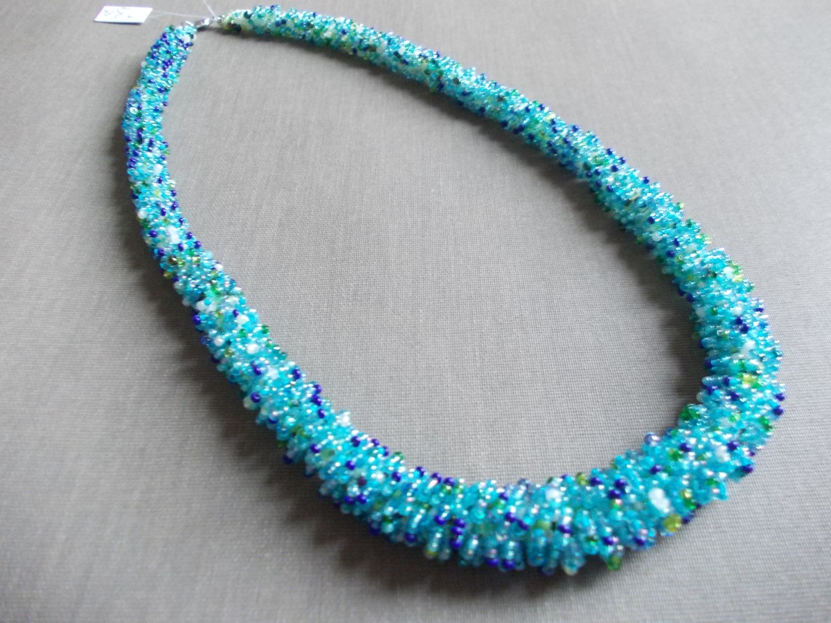 Roku darbs - dažādas pērles gan forma gan toņi, žgutu - tārps, galvenais foto, sarkans ar baltu 52 cm gara, 1. foto zils ar baltu un gaiši zils, 57 cm. gara 2. rota dzeltenie toņi un oranžie, 52 cm gara 3., zaļas un baltas pērles 47 cm gara,