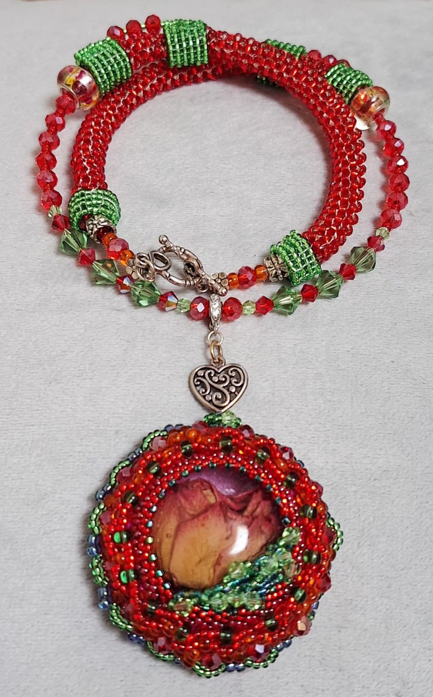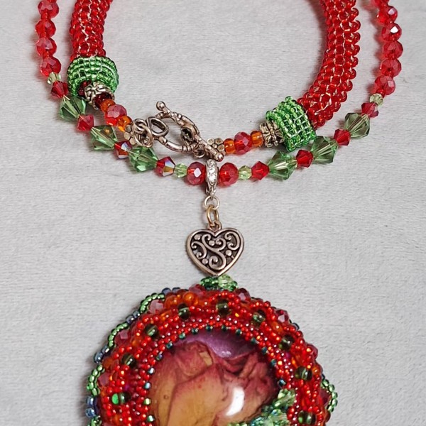 Sarkana stikla sīkpērlīšu kaklarota ar kulonu. Izmantotie matieriāli: sīkpērlītes (Čehija, Japāna, Ķīna), atmiņas stieple, kabašons izgatavots no epoksīda sveķiem ar kaltētu ziedu (rozi), metāla aizdare un piekariņš - antīkais sudraba efekts. Kaklarotas garums aptuveni 58 cm (bez aizdares), kulona diametrs 6 cm. Kulonu ir iespējams noņemt un iegādāties atsevišķi, šajā gadījumā kulona cena EUR 16,00 un kakla rotas cena EUR 12,00.
