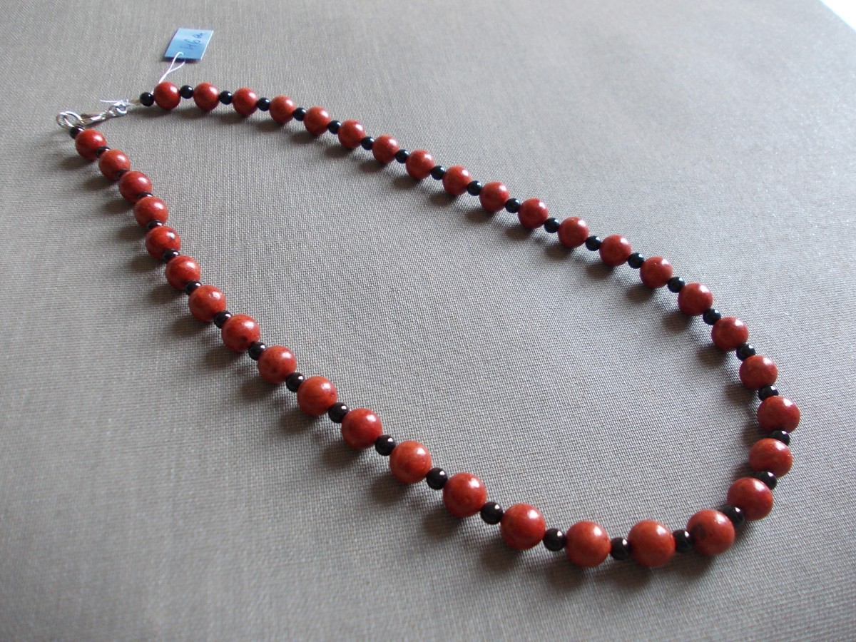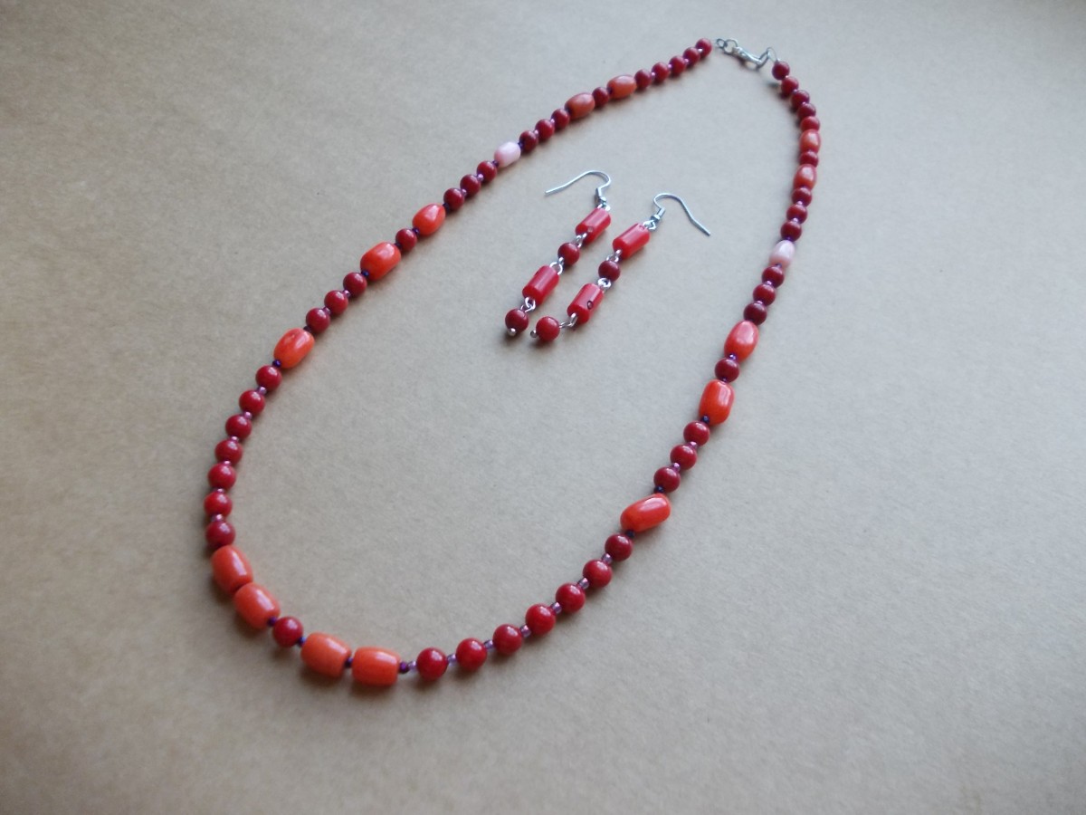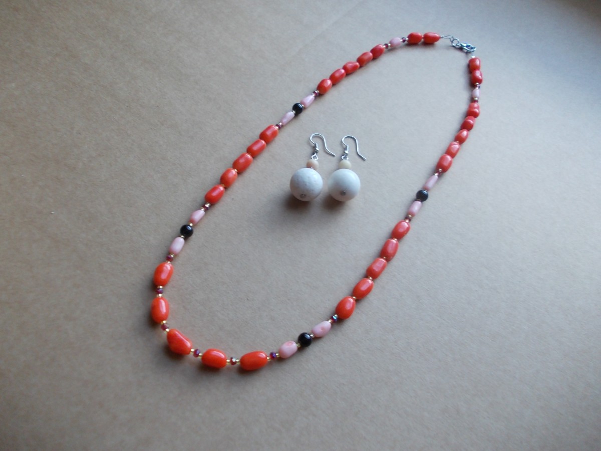 galvenais foto korāļa akmens griesti un pulēti lieli gabali rota 49 cm gara, cena 55.00 eiro, 1. foto dažāda toņa rozā, sarkans un 4 - pērles oniks 6mm, pērlītes AB kristāli, 54 cm gara, cena 52.00 eiro, 2. foto konusi sarkani un rozā 6 mm pērles, AB kristāli, 51 cm gara, cena 54.00 eiro, 3. visas 6 mm korāla pērles pamīšus ar oniksa pērlēm, 46 cm gara, cena 47.00 eiro, auskari 12.00 eiro.